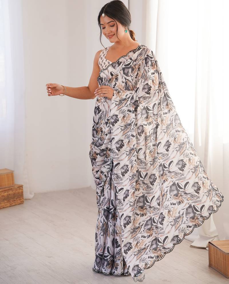 | Product Description | This Multicolor Chinon Saree Features A Soft Floral Digital Print In Shades Of Grey, Black, And Muted Tones Spread Evenly Across The Fabric. The Light Base Enhances The Darker Leaf And Floral Patterns, Creating A Balanced And Neat Overall Look. A Subtle Printed Border Detail Adds Definition Along The Edges, Giving The Saree A Clean Finish. Crafted From Smooth Chinon Fabric, The Saree Offers A Fluid Drape And Lightweight Feel. It Forms Structured Pleats While Maintaining A Soft Fall. The Saree Comes With A Matching Blouse Piece Designed To Coordinate With The Print And Color Theme. The Combination Of Subtle Tones And Detailed Digital Design Makes This Saree Suitable For A Refined And Well Put Together Appearance. |