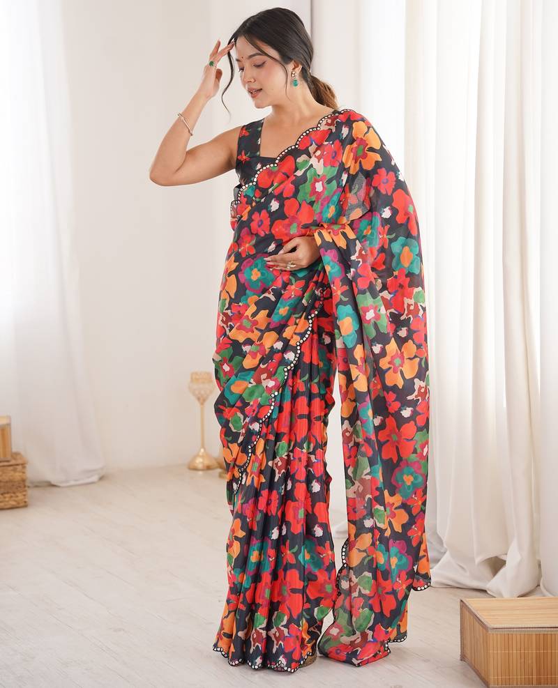| Product Description | This Multicolor Chinon Saree Features Bold Floral Digital Prints Set Against A Dark Base, Creating A Striking Contrast. The Combination Of Red, Green, Orange, And Yellow Tones Adds Depth And Character To The Overall Design. The Scalloped Border Detail Along The Edges Gives The Saree A Neat And Refined Finish That Enhances The Printed Pattern. Crafted From Lightweight Chinon Fabric, The Saree Offers A Smooth Texture And Fluid Drape That Forms Soft Pleats. The Breathable Material Makes It Comfortable To Wear While Maintaining A Graceful Fall. It Comes With A Matching Blouse Piece That Complements The Vibrant Print, Completing The Overall Look With A Balanced And Coordinated Finish. |