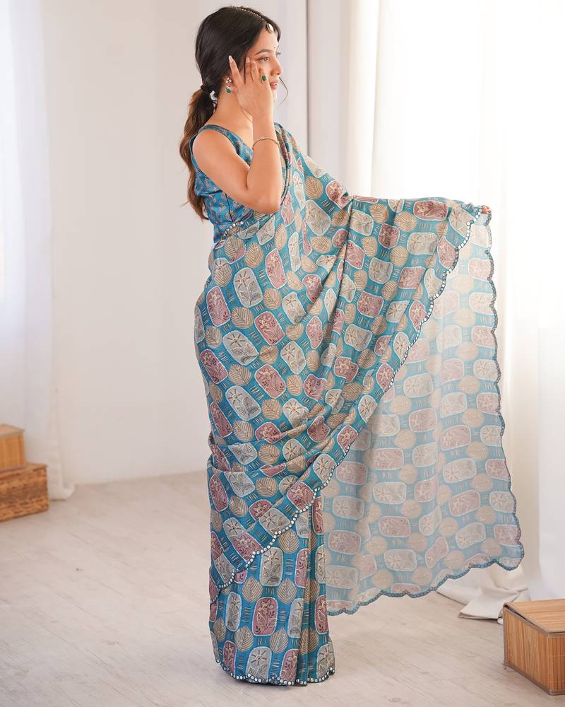 | Product Description | The Teal Chinon Saree Features A Soft Digital Print Arranged In A Repeated Leaf Inspired Pattern Across The Fabric. Muted Tones Of Beige And Soft Pink Blend Smoothly With The Teal Base, Creating A Balanced And Steady Look. The Chinon Material Has A Lightweight And Flowing Texture, Allowing The Saree To Drape Naturally And Form Neat Pleats. The Printed Border Along The Edges Provides A Clean Finish Without Overpowering The Overall Design. This Saree Comes With A Matching Blouse Piece That Follows The Same Digital Printed Theme. The Blouse Fabric Can Be Stitched According To Preferred Fit And Style. The Smooth Chinon Texture Ensures Comfort For Long Hours And Helps Maintain A Graceful Fall. The Combination Of Soft Teal Shade And Detailed Digital Print Makes This Saree Suitable For Women Who Prefer Light Fabrics With Clear And Structured Patterns. |