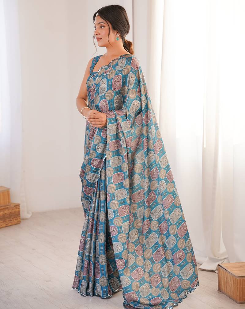 Women s teal digital printed chinon saree with blouse