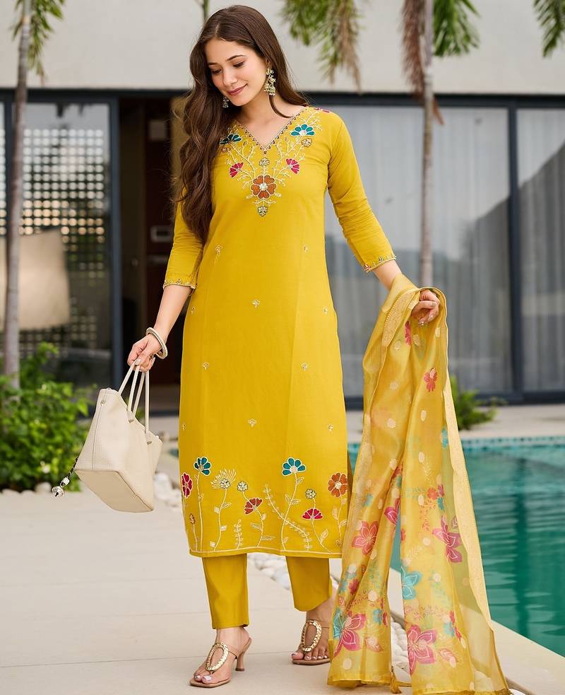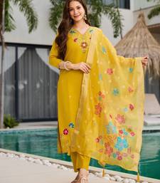 Yellow embroidered beads viscose gadhwal kurta set with dupatta stitched