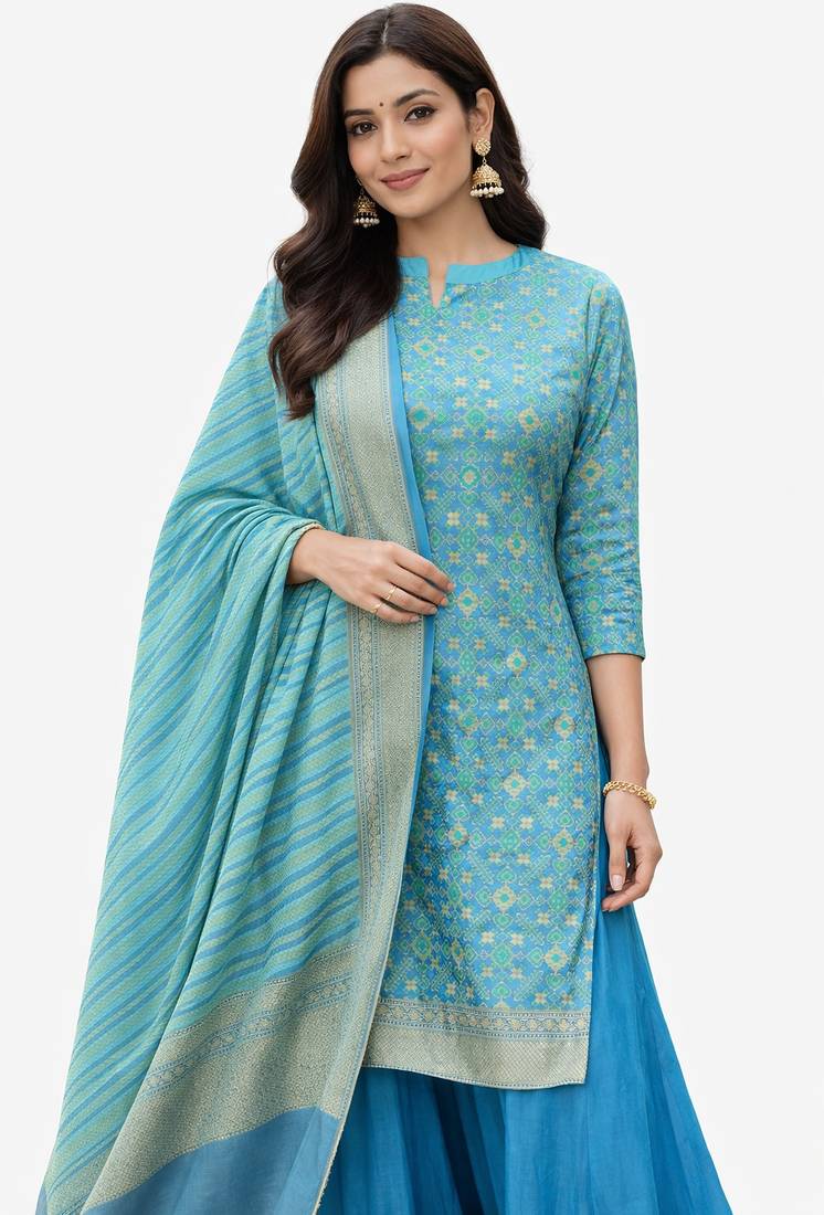 Crafted In Luxurious Banarasi Weave, Offering A Regal Sheen And Timeless Appeal.Detailed Traditional Patterns Across The Kurta Add Depth And Elegance.Striped Banarasi Dupatta With Zari Borders Enhances The Overall Ethnic Charm. Paired With A Flowy, Wide Legged Bottom For Comfort And Graceful Movement. Perfect For Celebrations, Family Gatherings, And Ethnic Occasions With A Refined Look.