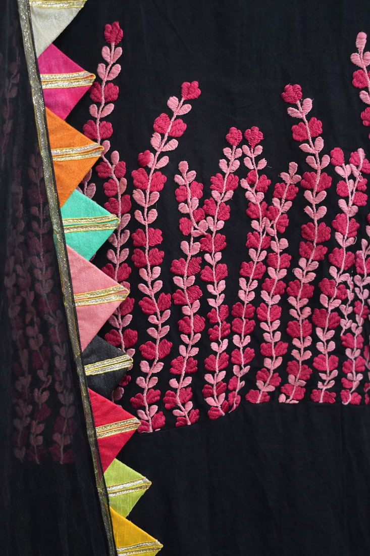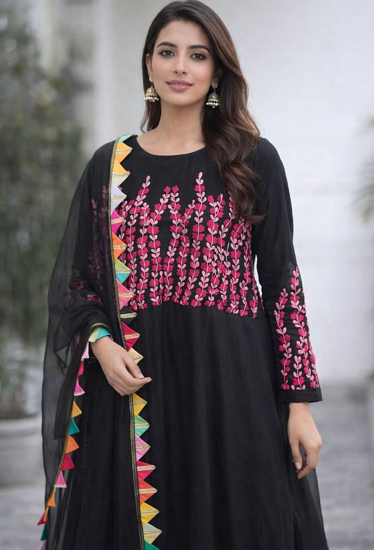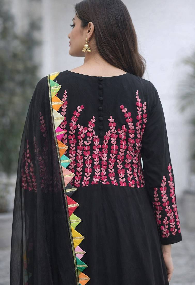 | Product Description | A Timeless Black Kurta Set Adorned With Intricate Thread Embroidery For A Refined, Elegant Look. Paired With A Beautifully Detailed Dupatta Finished With Vibrant, Colourful Lace, It Adds A Playful Contrast To The Classic Base. Perfect For Festive Gatherings, Intimate Celebrations, And Effortless Everyday Elegance. |