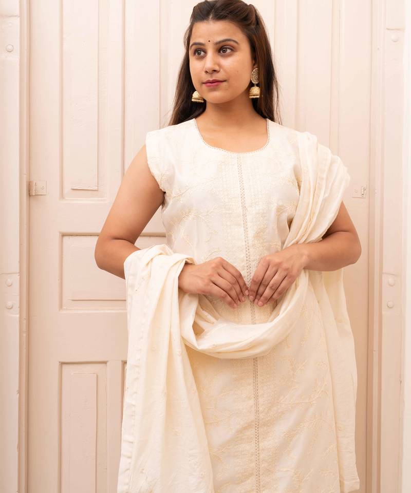 Chanderi self weaving white suit set stitched