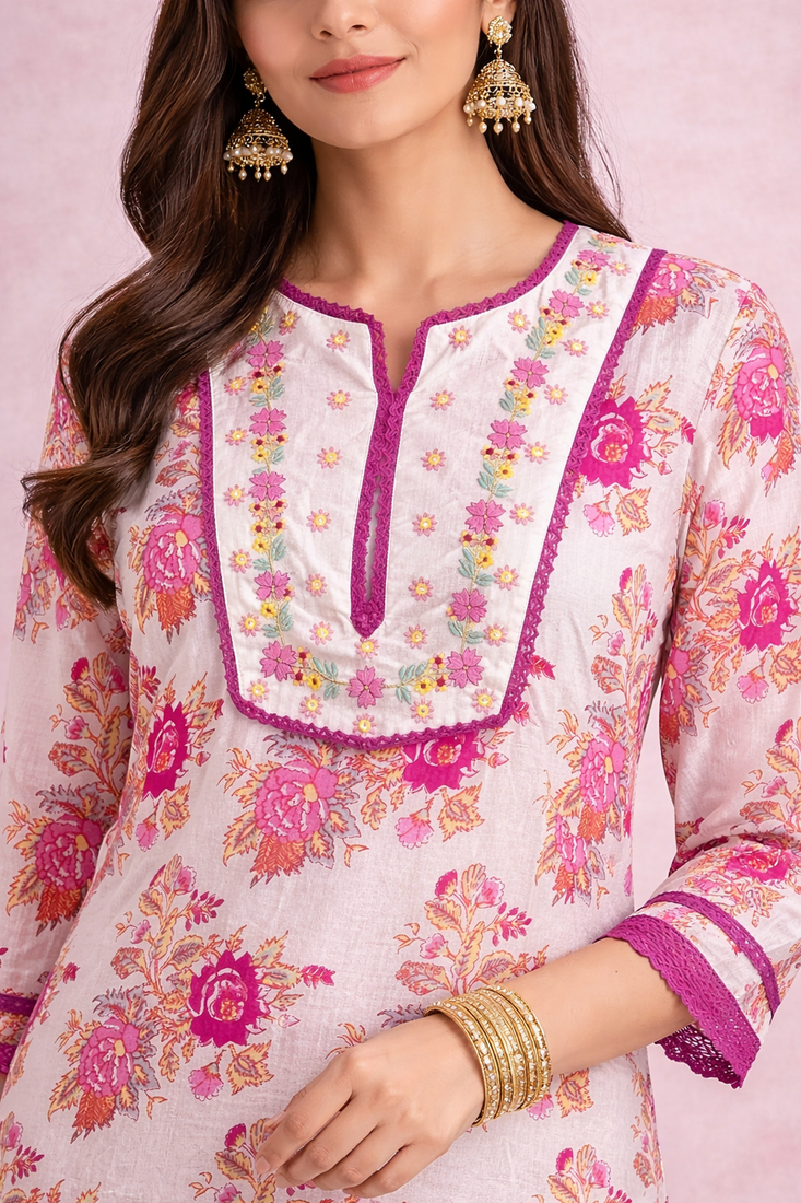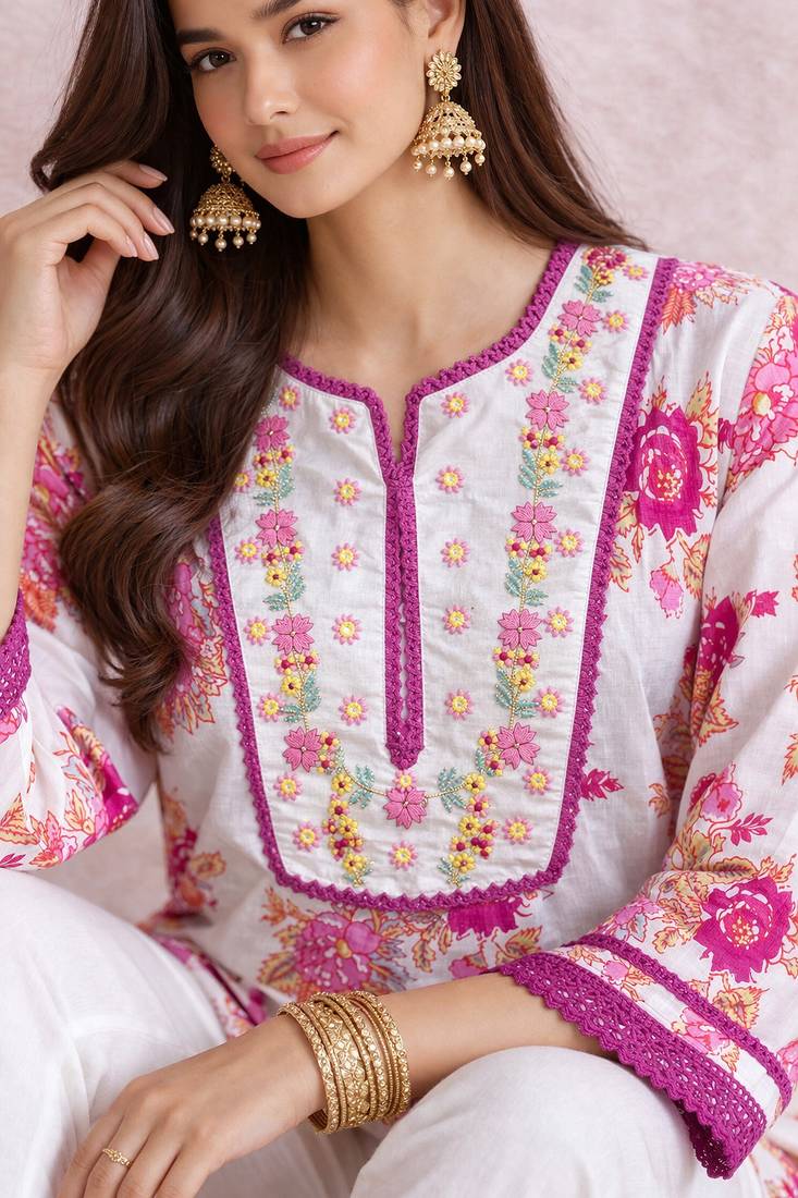 | Product Description | A Floral Printed Kurta Embellied With Crochet Lace & Embroidery |