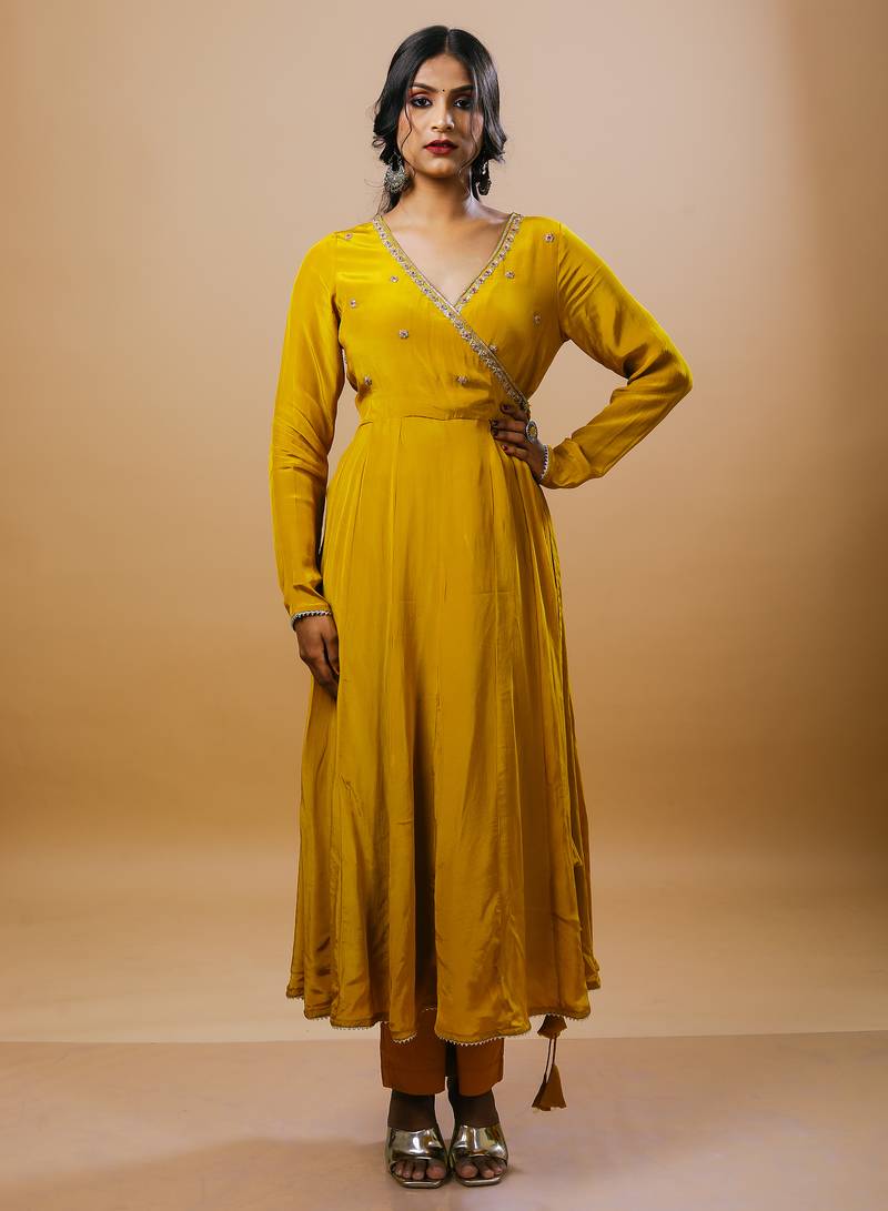 Mustard crepe embroidered kurta sets