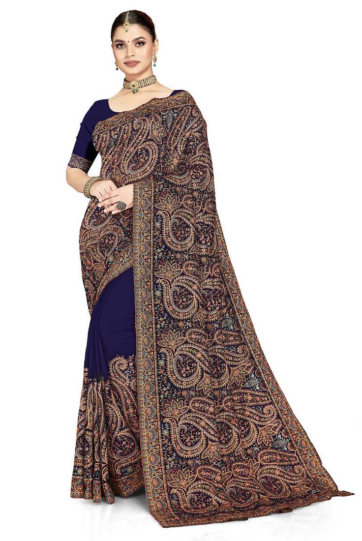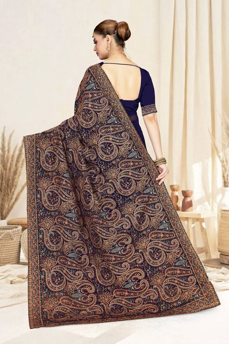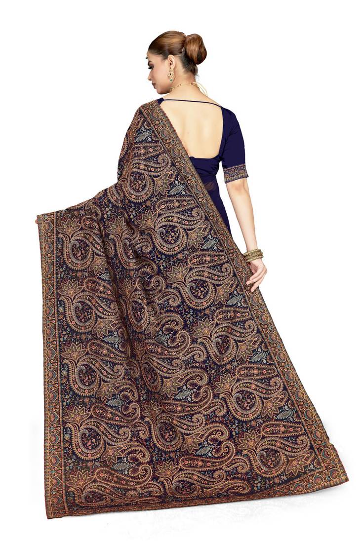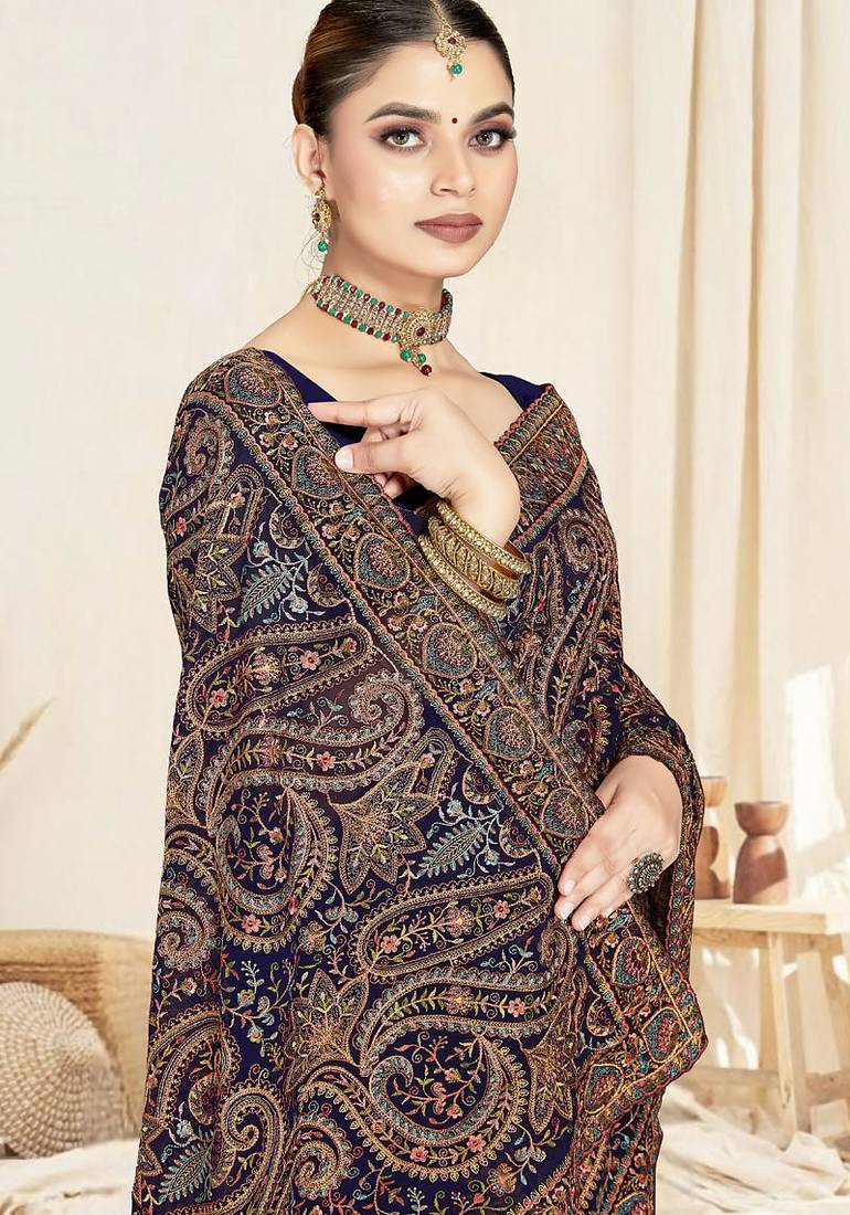 Designer navy blue resham multi kashmiri embroidery work georgette saree