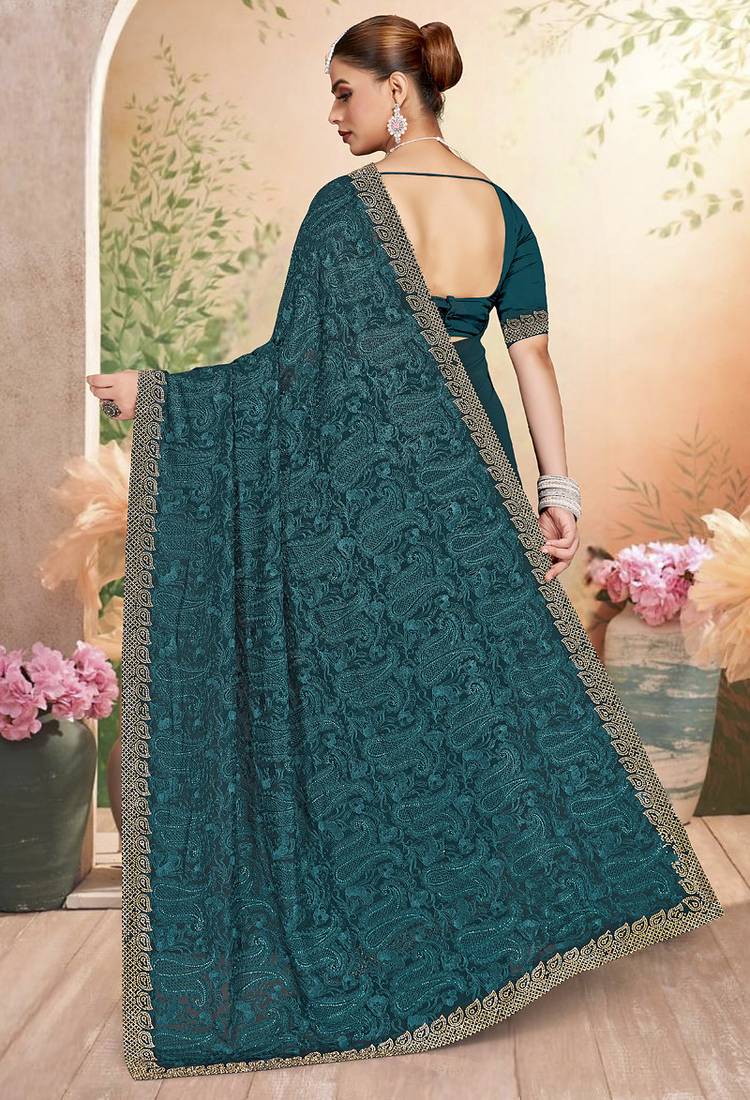 | Product Name | Designer Teal Blue Resham Embroidery Zarkan Border Georgette Saree | |