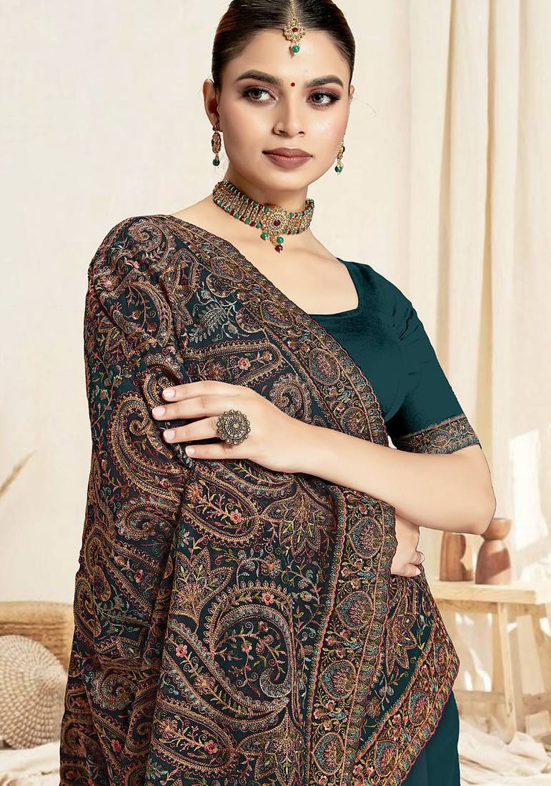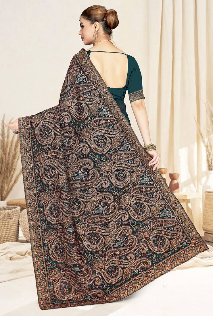 Designer teal blue resham multi kashmiri embroidery work georgette saree