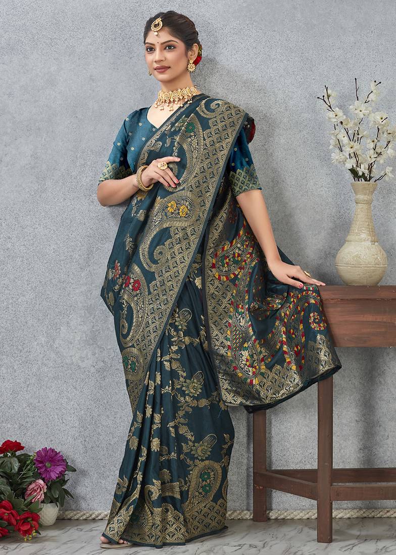 Designer teal blue zari weaving tassel pallu work silk blend saree
