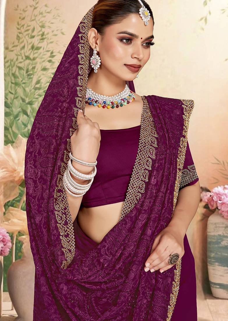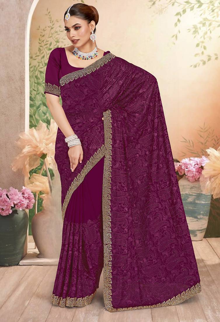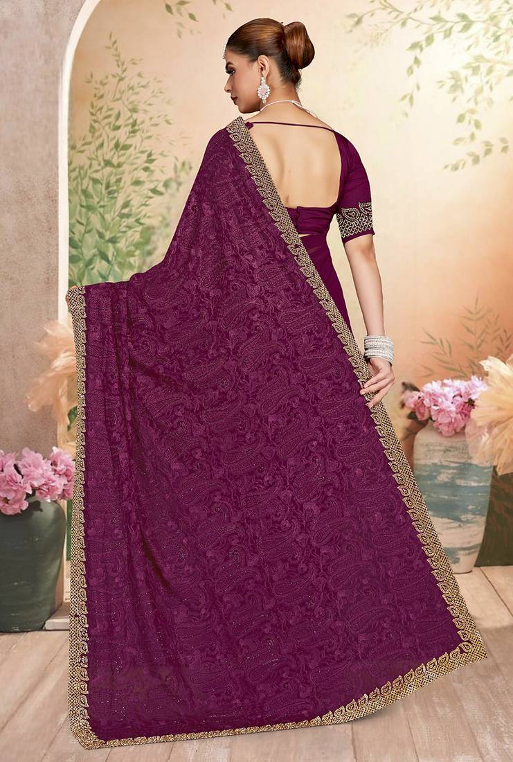 | Product Name | Designer Wine Resham Embroidery Zarkan Border Georgette Saree | |