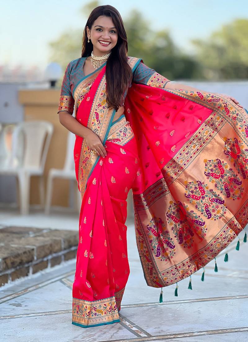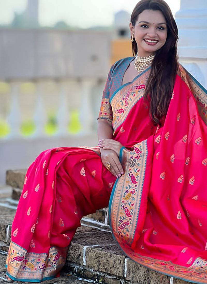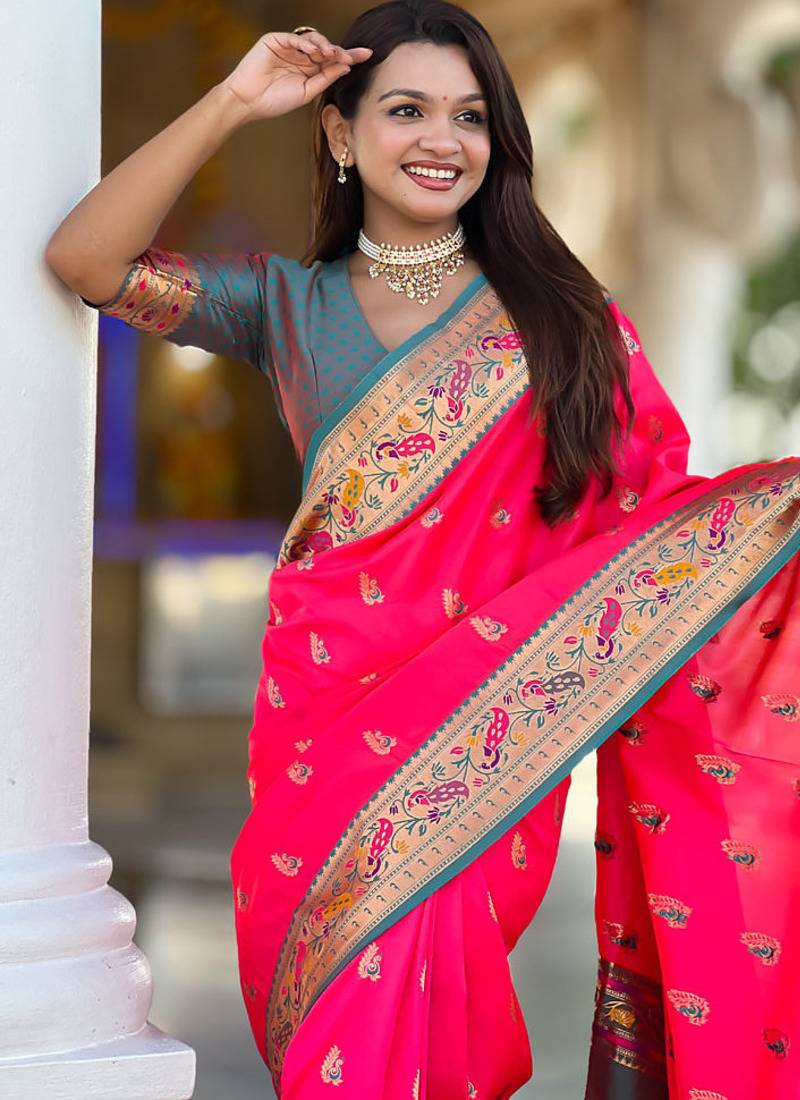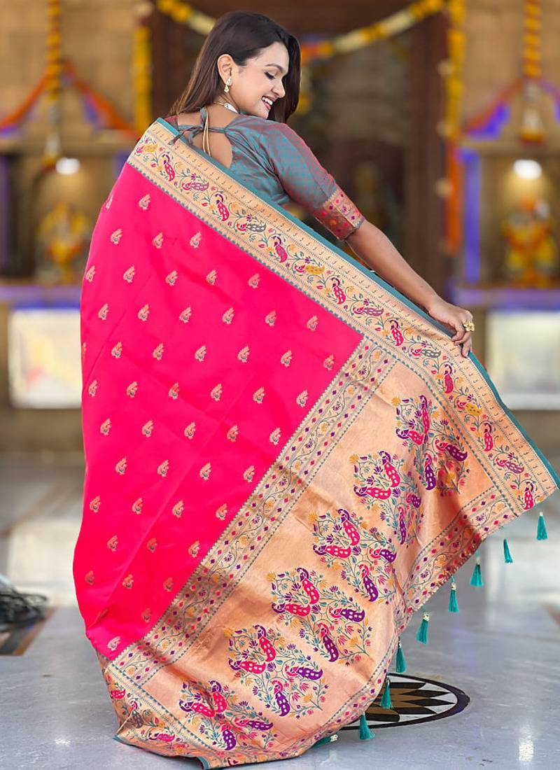 | Product Name | Indian Pink Zari Motif Weaving Work Paithani Silk Saree | |