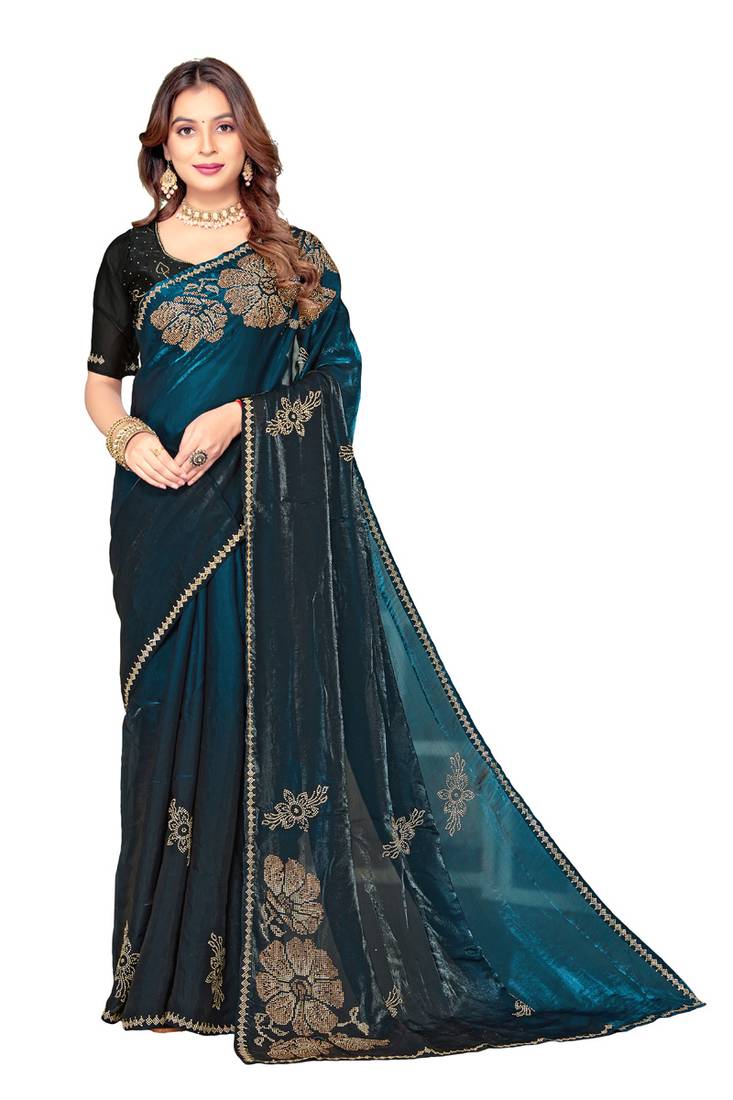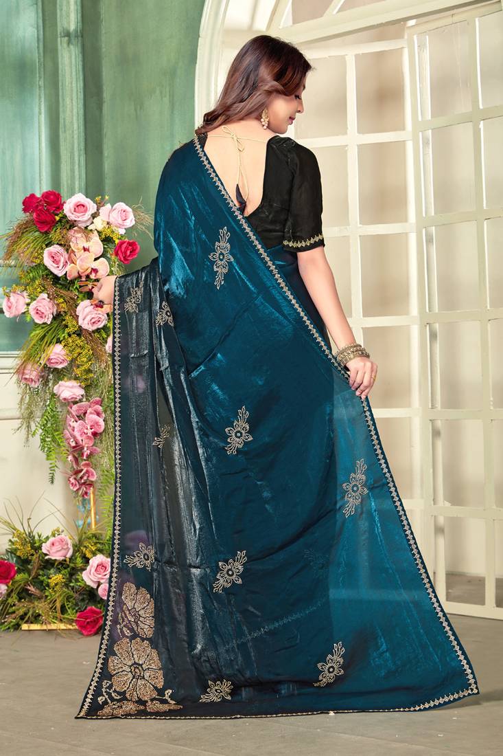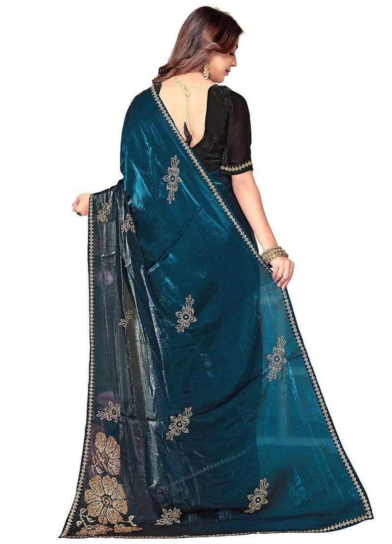 | Product Name | Indian Teal Blue Zarkan Handwork Satin Silk Blend Saree | |