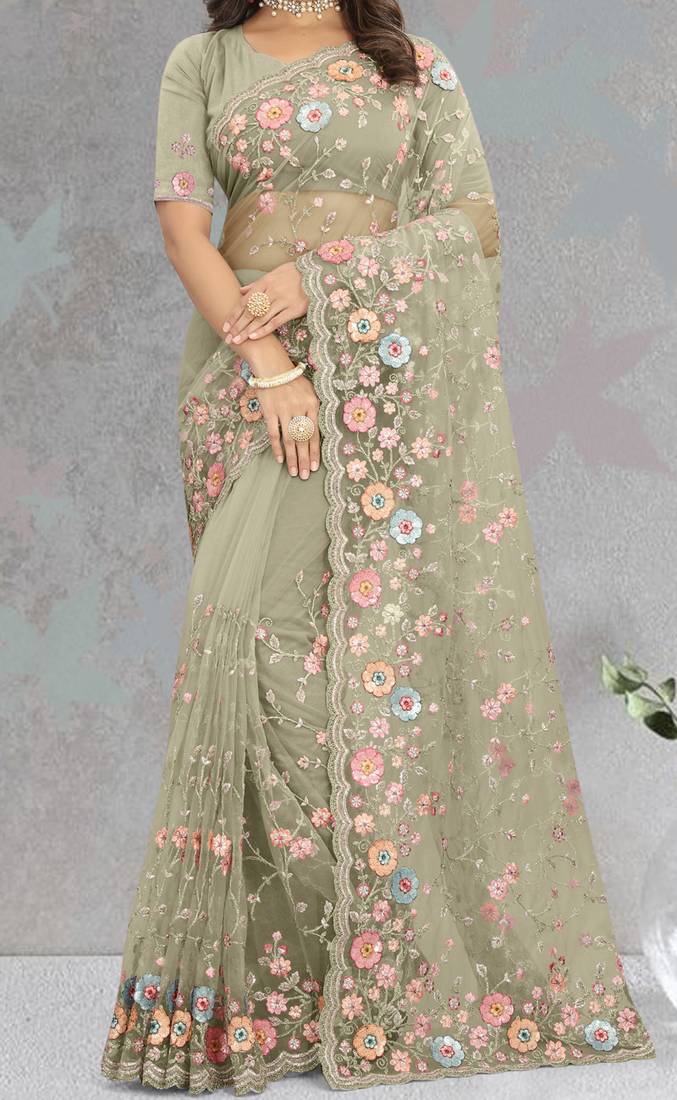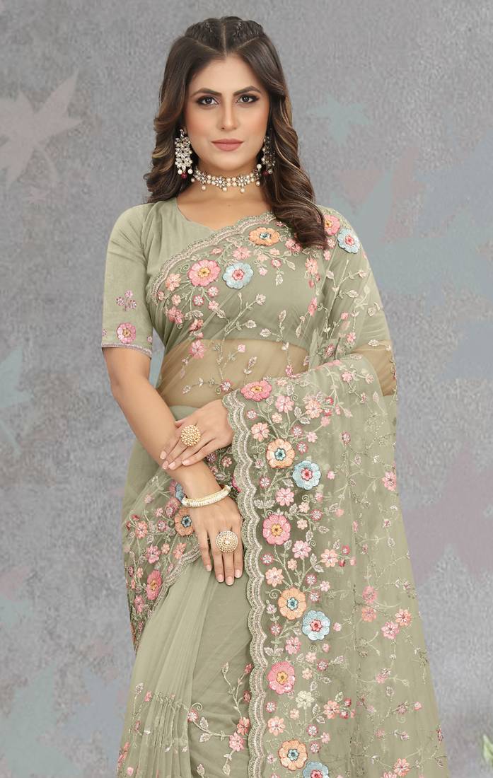 | Product Name | Pista Resham Coding Multi Sequence Embroidery Net Saree With Blouse | |