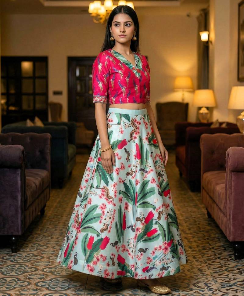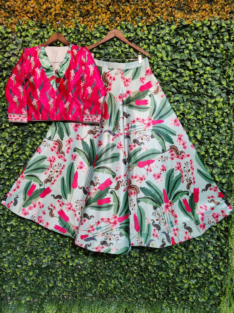 | Product Description | "Pink And Sea Green Printed Croptop Lehenga Choli Without Dupatta,