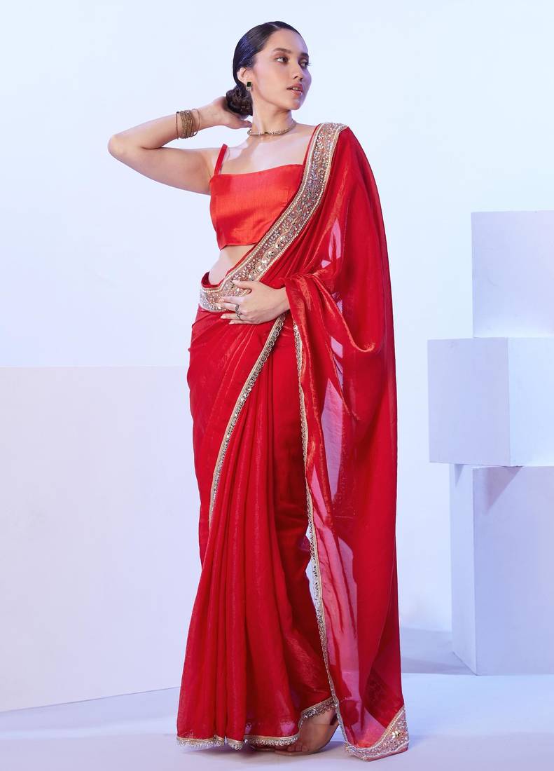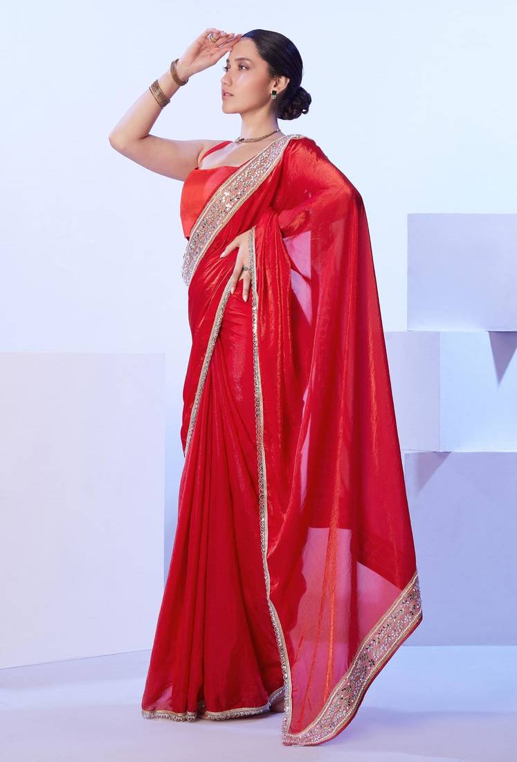 Red mirror work lace embellished saree with blouse