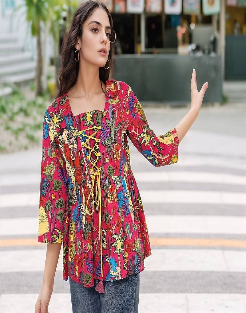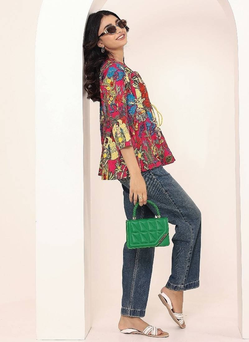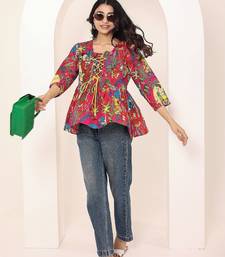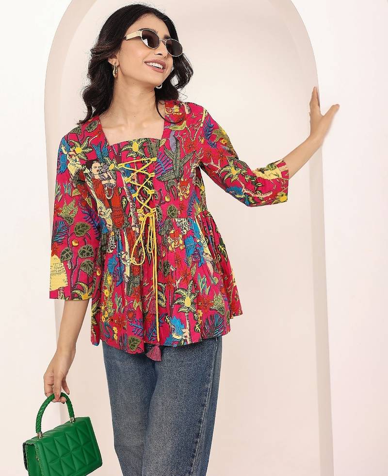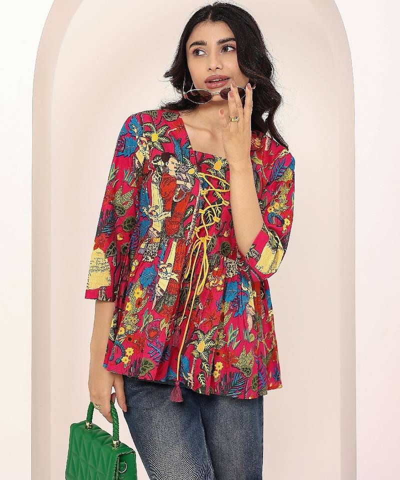 Product Name | Navy Blue Tropical Print Angrakha Style Cotton Kurta Top | |
