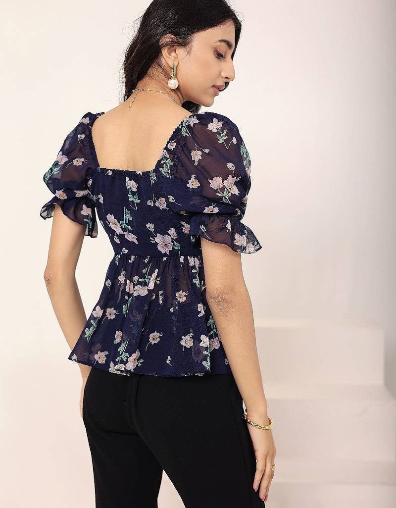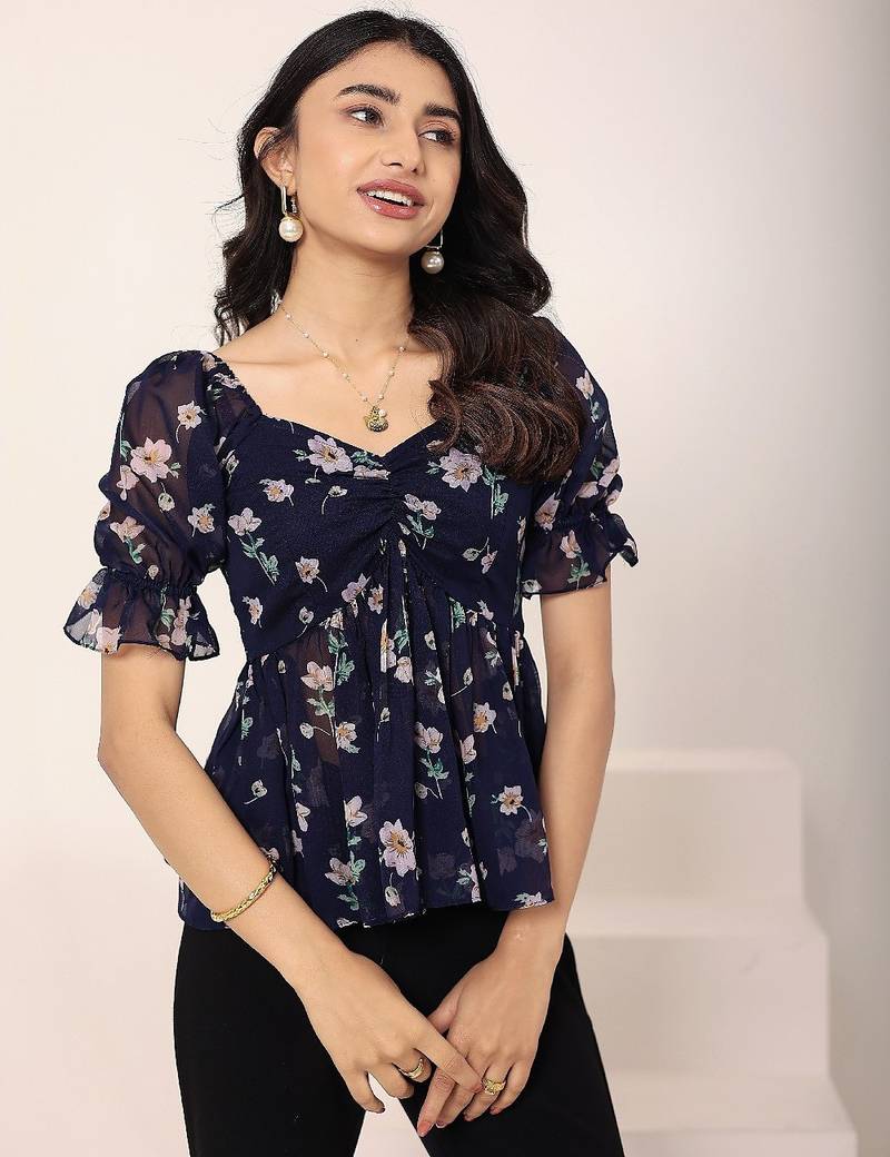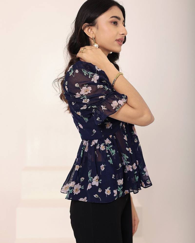 Product Name | Navy Blue Tropical Print Angrakha Style Cotton Kurta Top | |