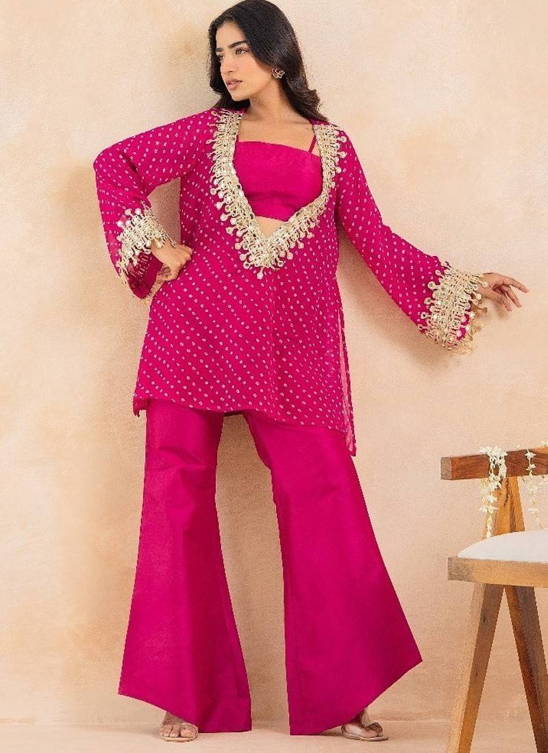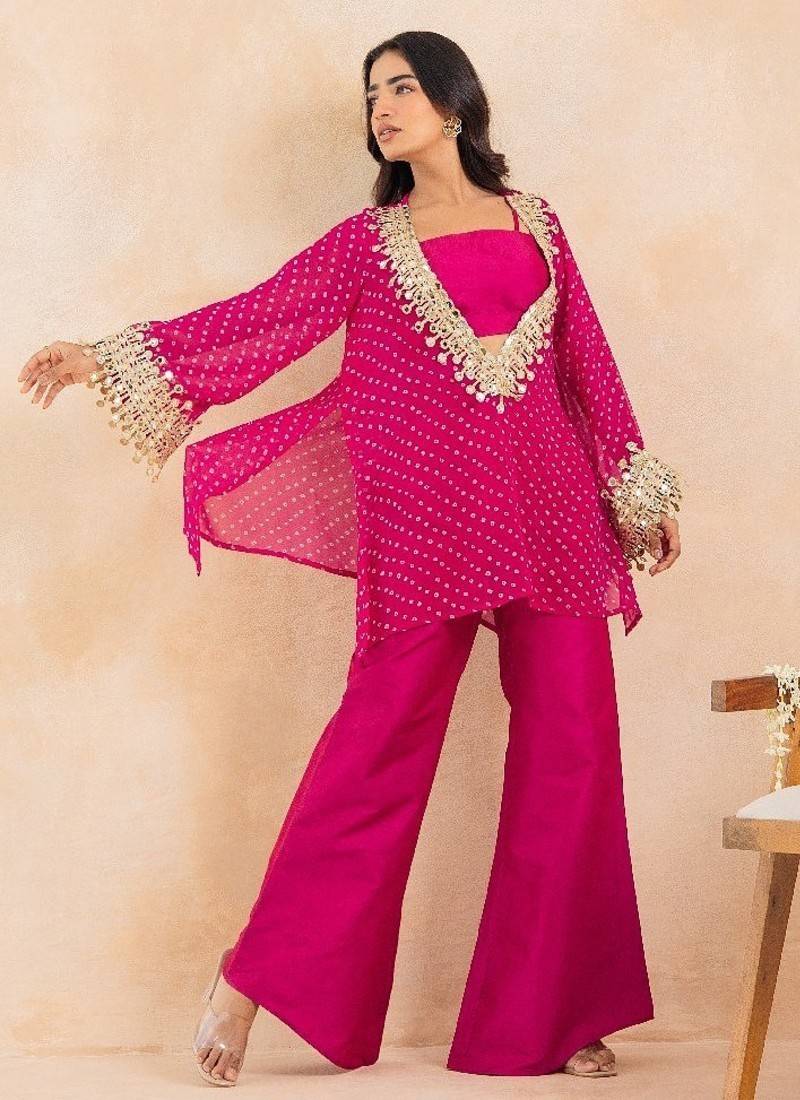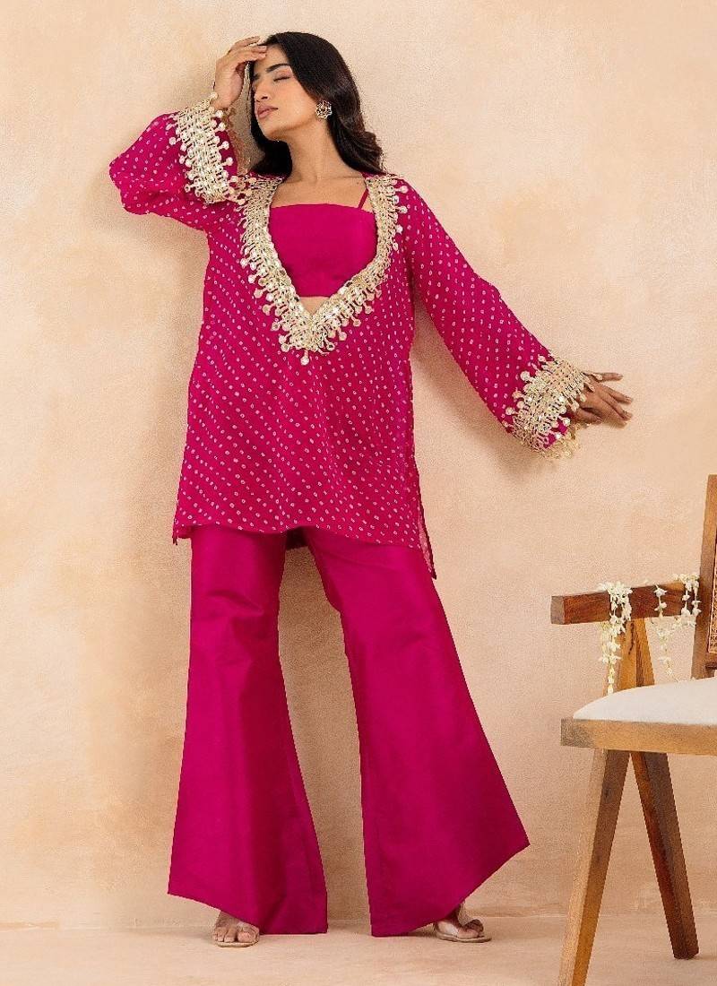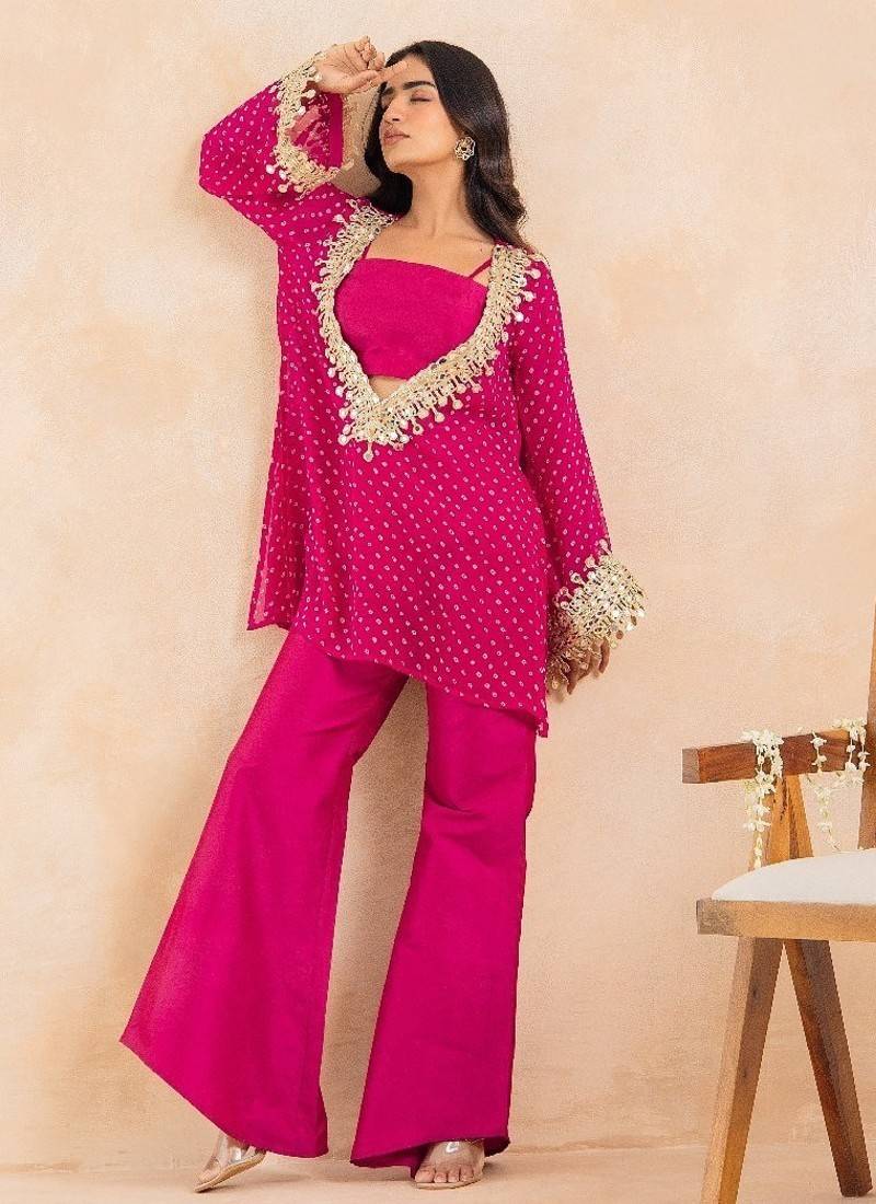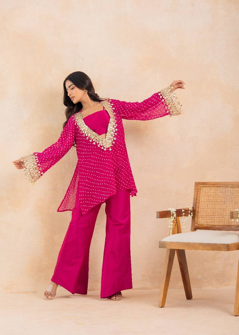 Product Description | Radiate Festive Charm With Noor, A Stunning Rani Pink Bandhej 3 Piece Set That Perfectly Blends Tradition With Modern Allure. The Ensemble Features A Heavily Mirror Embroidered Short Kurta, A Padded And Lined Choli, And Flared Pants, Creating A Vibrant And Flattering Silhouette. Crafted In Rich Bandhej Fabric With Intricate Mirror Detailing, This Look Is Designed To Make A Statement At Festive Gatherings, Mehendi Functions, Or Wedding Celebrations. The Padded Choli Ensures Structure And Comfort, While The Flared Pants Add A Contemporary Touch To This Timeless Festive Set. Product Measurements: Kurta Length: 25" Choli Length: 14.5" Pant Length: 39" Fabric: Bandhej (Lined Choli For Added Comfort) |
