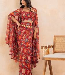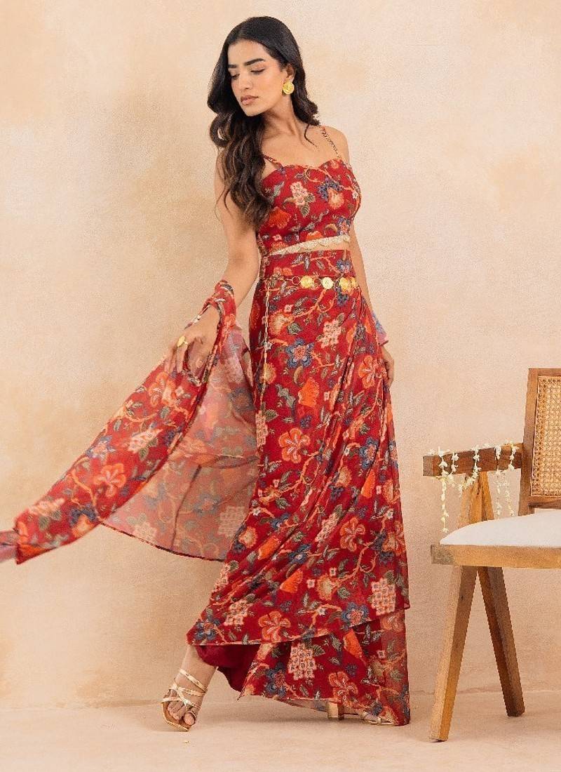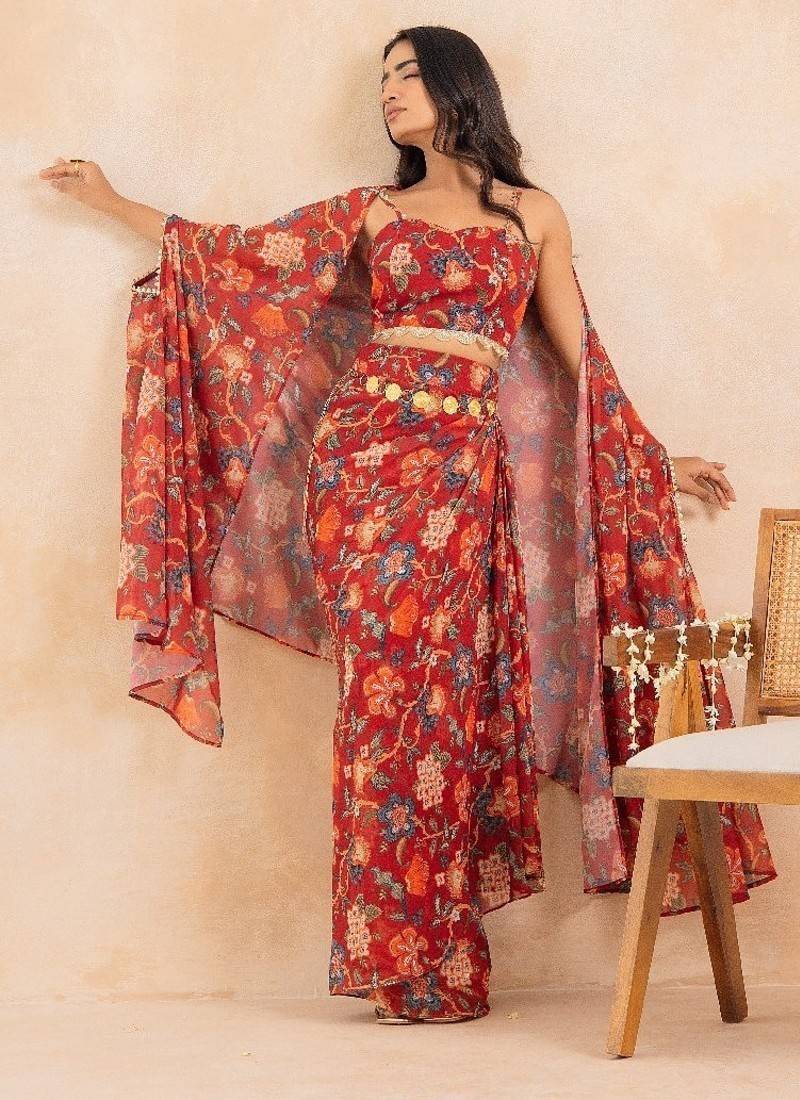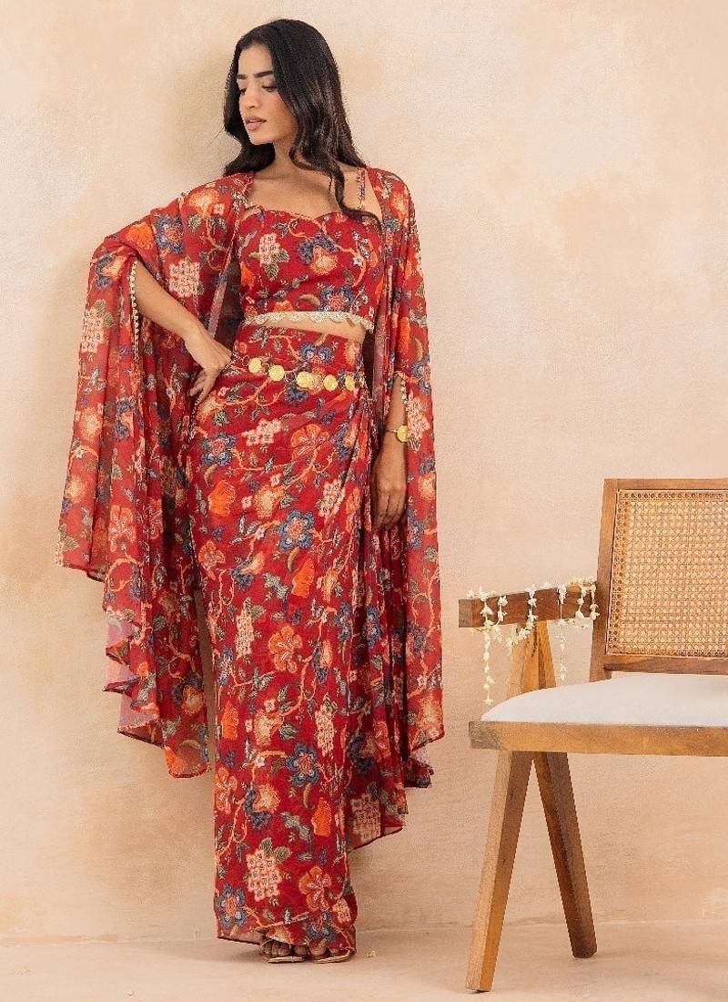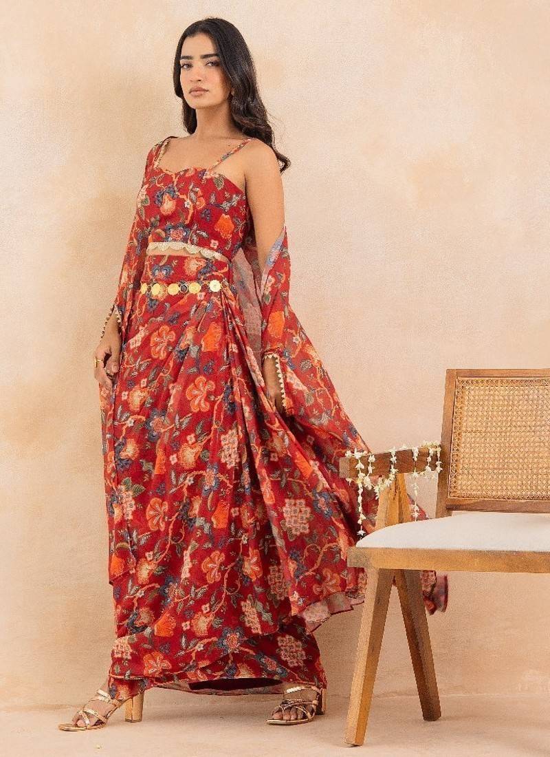 Product Description | Step Into Festive Elegance With Ruhani, A Stunning Red Floral Printed 3 Piece Set That Beautifully Merges Traditional Charm With Contemporary Styling. Crafted In Soft Georgette, The Ensemble Features A Padded Choli, A Draped Skirt, And A Flowy Cape Adorned With Delicate Lace Embellishment Detailing, Adding Just The Right Touch Of Shimmer And Grace. Designed With Full Lining In Both Blouse And Skirt For Structure And Comfort, This Silhouette Exudes Effortless Glamour — Perfect For Cocktail Soirées, Sangeet Celebrations, Or Festive Gatherings. The Floral Print And Draped Details Make It A Statement Piece That Moves With Poise And Confidence. Product Measurements: Choli Length: 14.5" Skirt Length: 44" Fabric: Georgette (Fully Lined; Padded Blouse) |