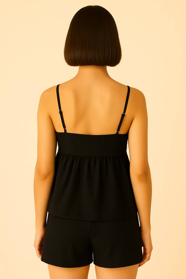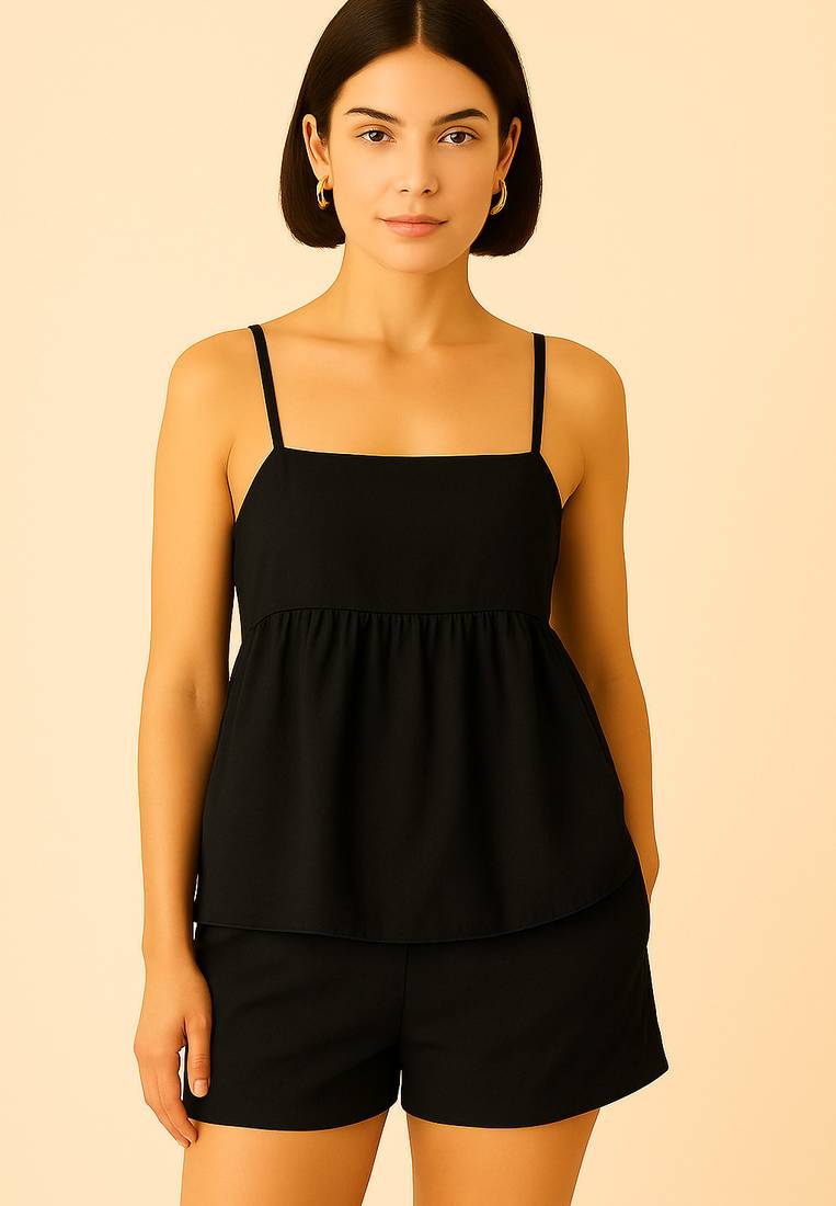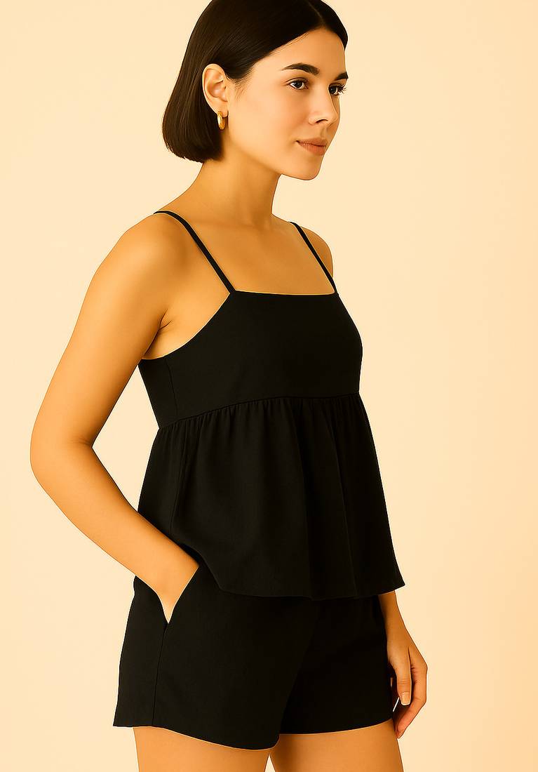 Women black cotton linen peplum strap top with elastic waist shorts co-ord set stitched