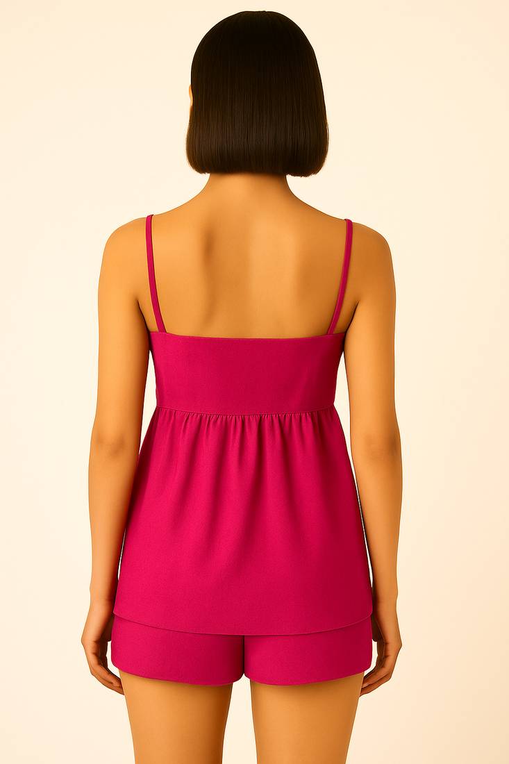 Women hot pink cotton linen peplum strap top with elastic waist shorts co-ord set stitched