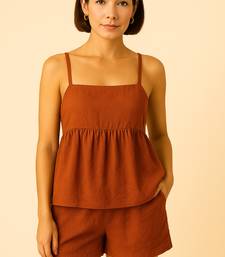 Product Name | Women Rust Brown Cotton Linen Peplum Strap Top With Elastic Waist Shorts Co Ord Set | |