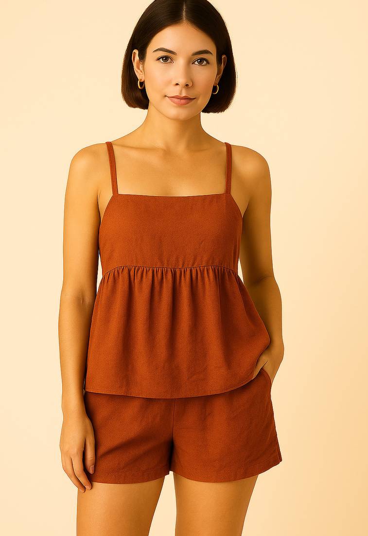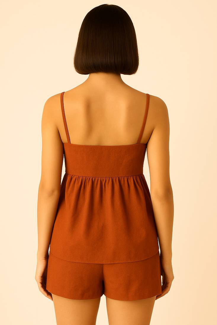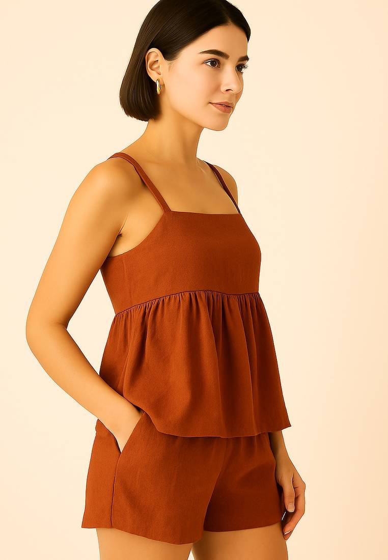 Women rust brown cotton linen peplum strap top with elastic waist shorts co-ord set