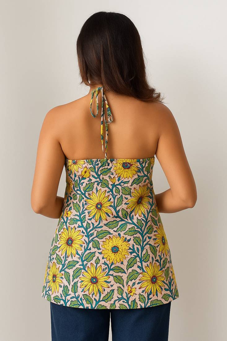 Women s 100% cotton printed halter neck short kurti back elastic, side slits, tie-up neck | casual summer wear