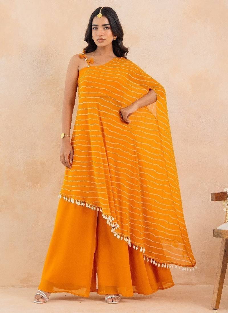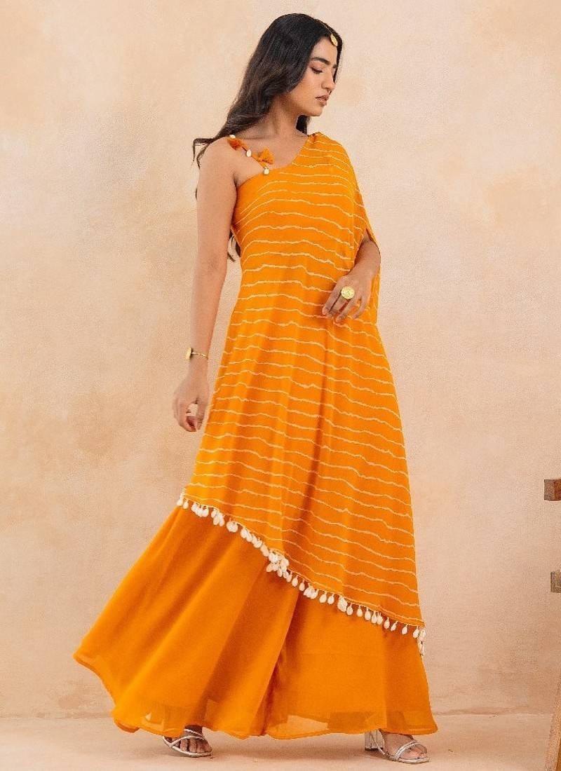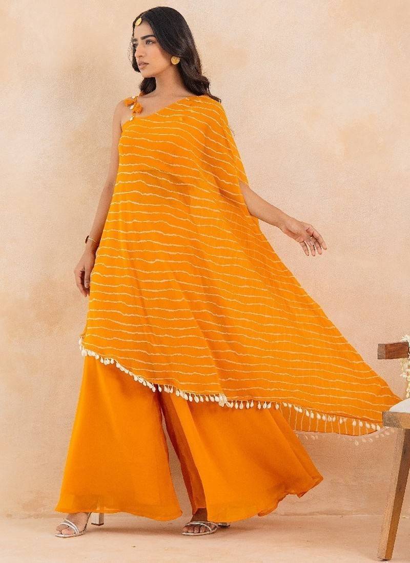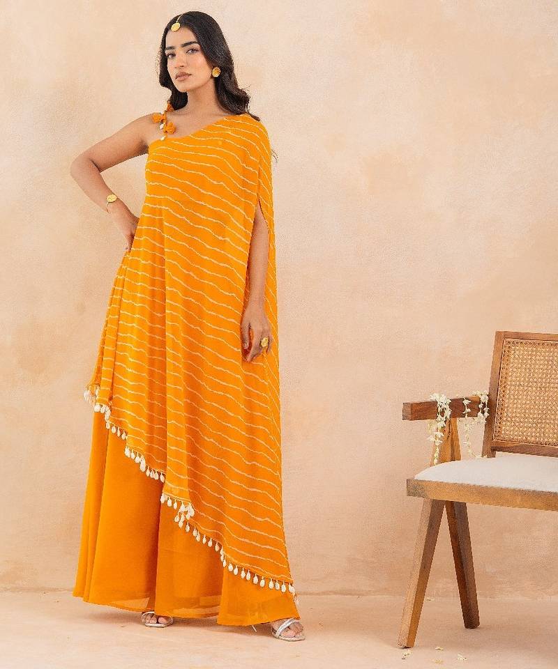 Product Name | Yellow Leheriya One Shoulder Drape Cape Set With Palazzo & Choli | |