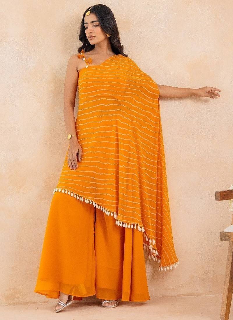 Product Description | Add A Burst Of Sunshine To Your Festive Wardrobe With This Vibrant Yellow Leheriya Drape Cape Set, Crafted In Soft Georgette For An Effortlessly Fluid Look. The Set Features A Lace Embellished Choli, A Striking One Shoulder Draped Cape, And Flared Palazzo Pants, Blending Timeless Rajasthani Leheriya With A Chic Modern Silhouette. Thoughtfully Designed For Both Comfort And Statement Style, The Top And Bottom Come With Full Lining, Ensuring A Flawless Fit. The One Shoulder Cape Adds A Contemporary Edge, While The Lace Detailing Lends A Festive Sparkle — Making It Perfect For Haldi Celebrations, Mehendi Functions, And Sundowner Events. Product Measurements: Blouse Length: 14.5" Palazzo Length: 44" Cape Length: 54" Fabric: Georgette (Lined Top & Bottom) |
