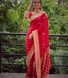 Celebrity inspired red banarasi south silk fancy saree with unstitched blouse