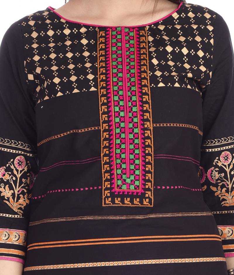 | Product Description | Kaustuki Beautiful Floral Print Black Cotton Quarter Sleeveswith Round Neck Neck With Floral Print Embroderised Woman Kurta With Skirt |
