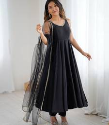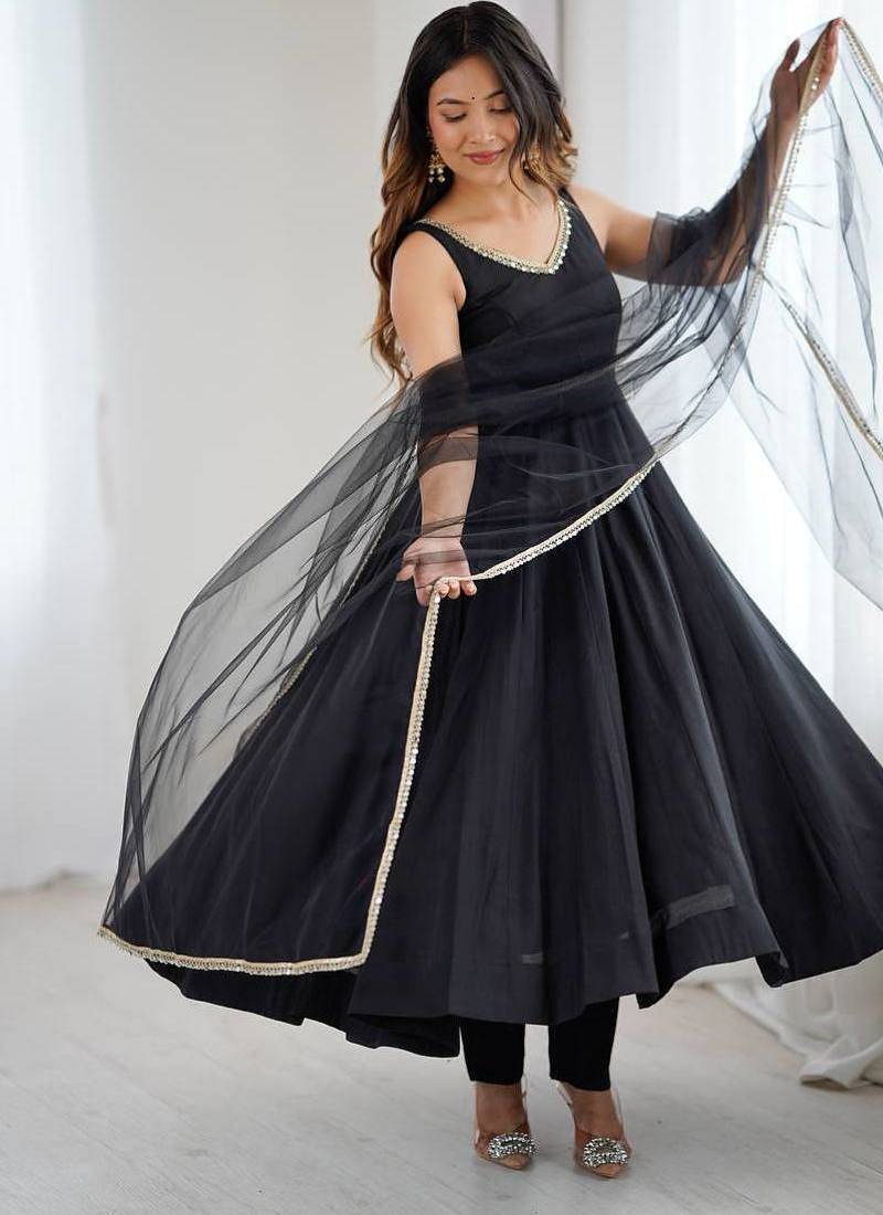 Product Name | Black Roman Silk Chanderi Anarkali With Fancy Lace Work, 4 Mtr Flair, Stitched Pant And Net Dupatta Set | |