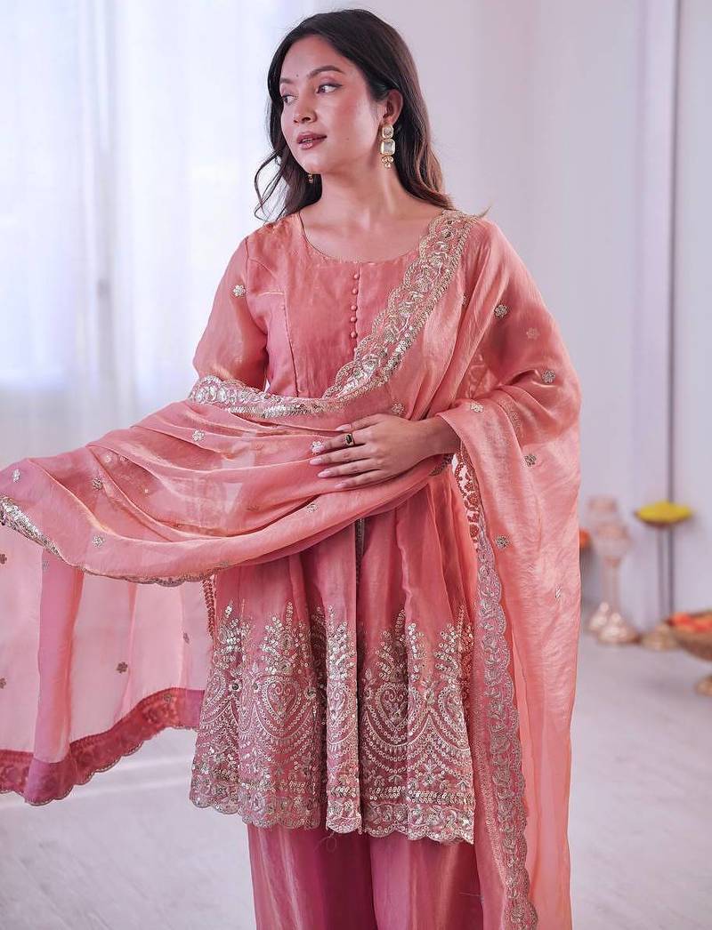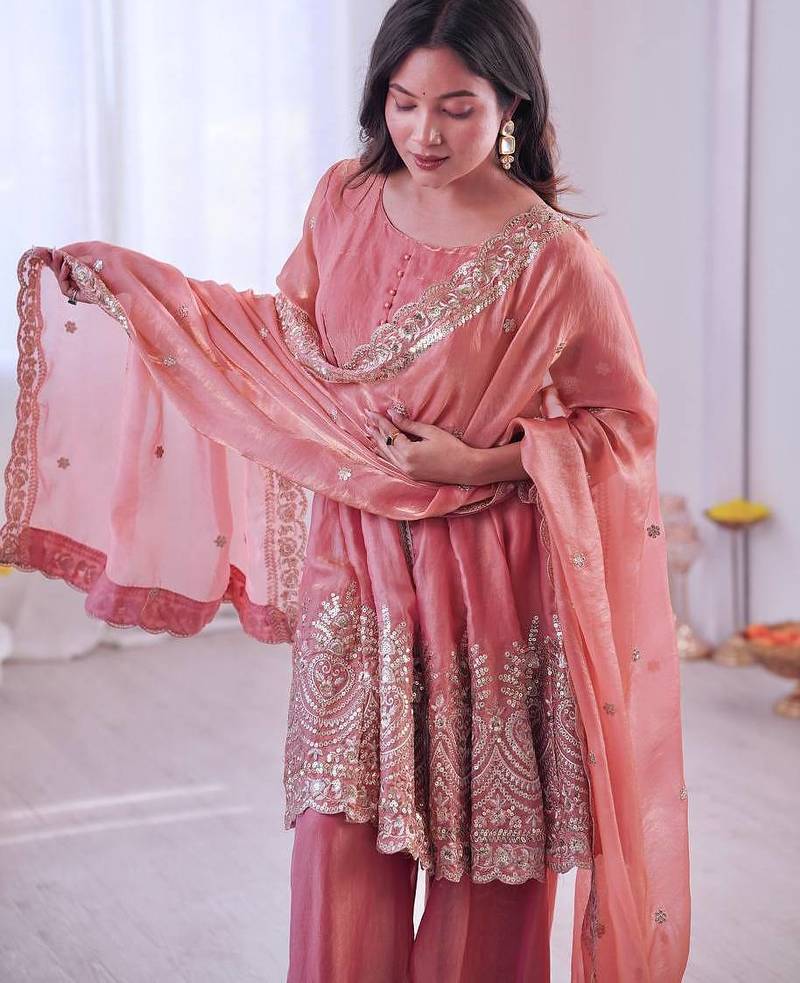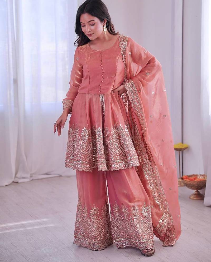 | Product Name | Blush Pink Two Tone Fandy Silk Heavy Embroidery Sequins & Mirror Work Fully Stitched Kurti Palazzo Set | |