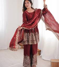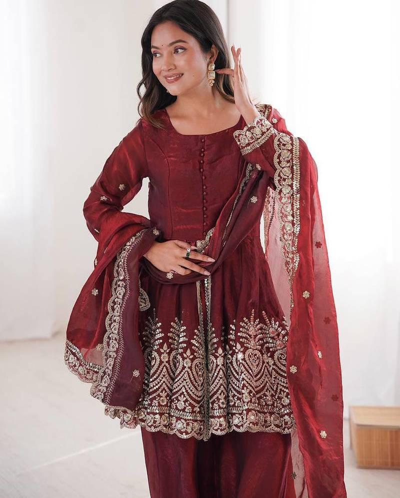 | Product Name | Maroon Two Tone Fandy Silk Heavy Embroidery Sequins & Mirror Work Fully Stitched Kurti Palazzo Set | |