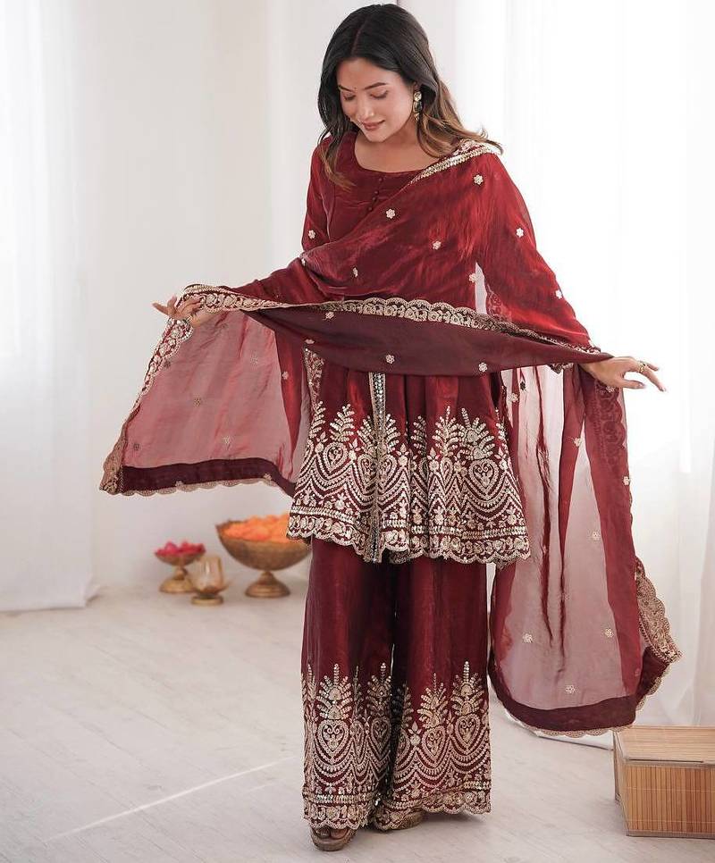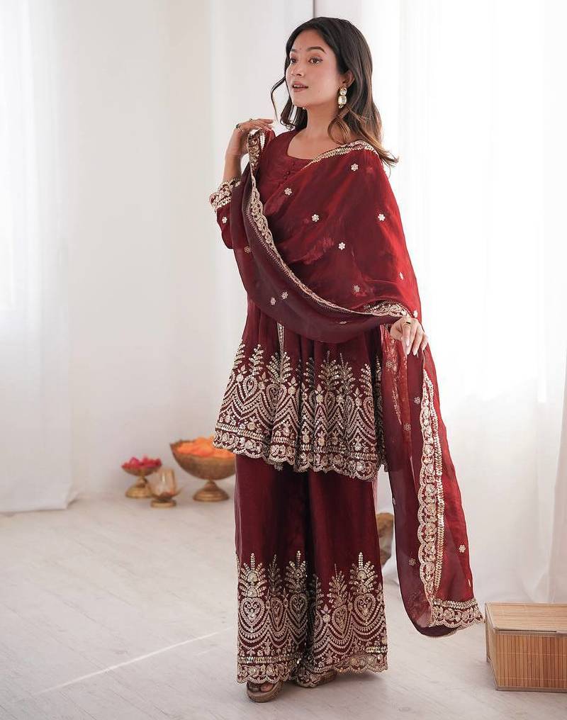 Maroon two tone fandy silk heavy embroidery sequins & mirror work fully stitched kurti palazzo set