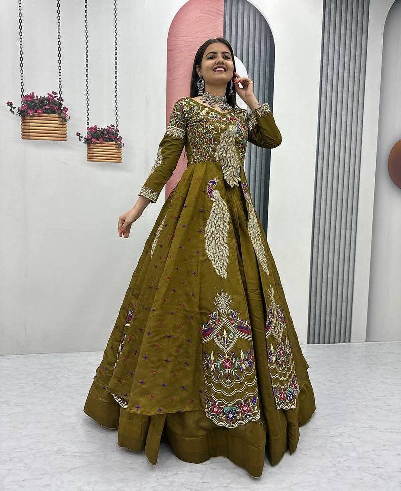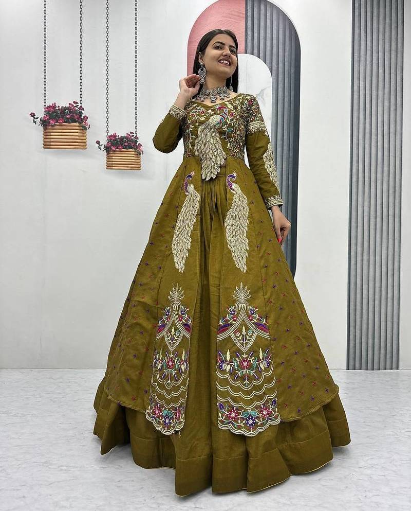 | Product Name | Olive Green Vichitra Silk Heavy Thread Sequins Work Lehenga Set | |