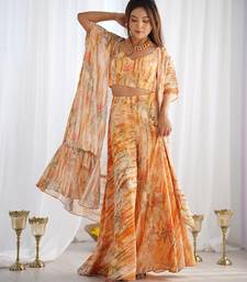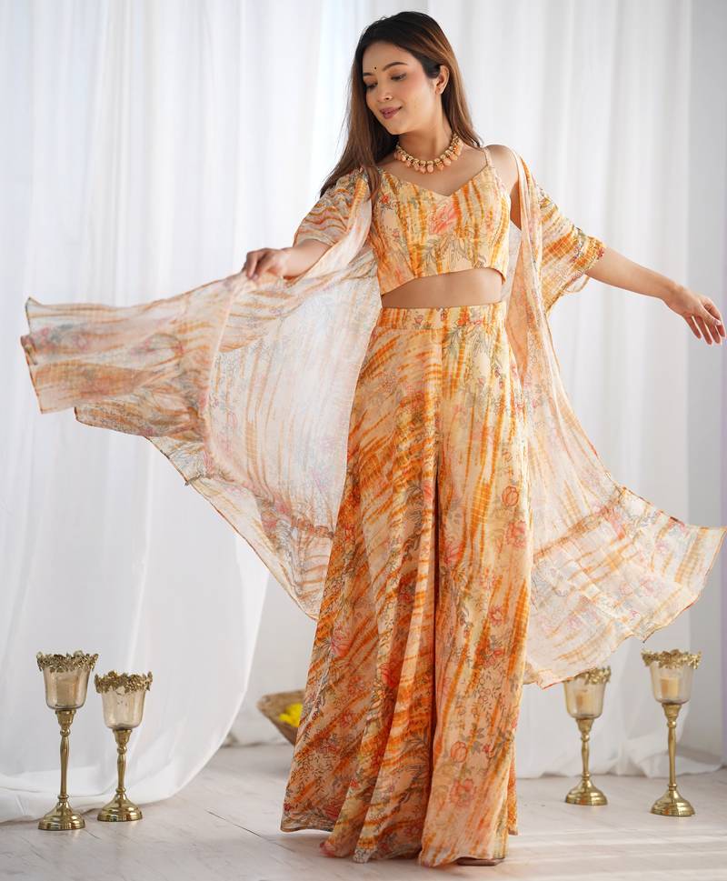 | Product Name | Peach Orange Floral Printed Soft Fox Georgette Fully Stitched Crop Top With Flared Palazzo Set | |