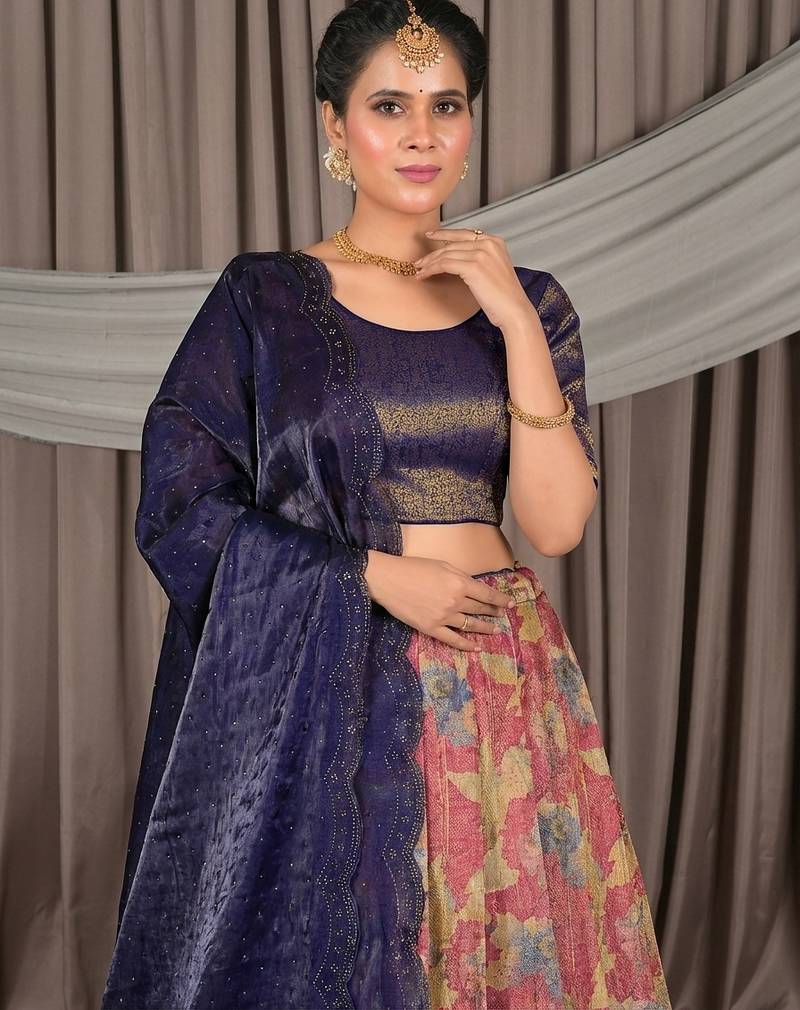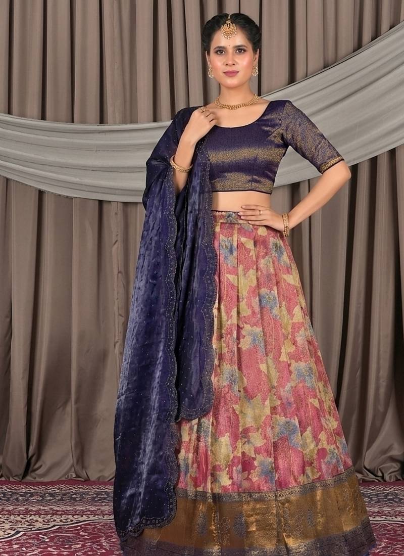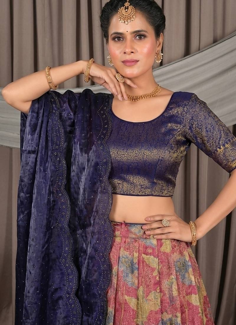 Pink & navy blue banarasi jacquard printed lehenga choli