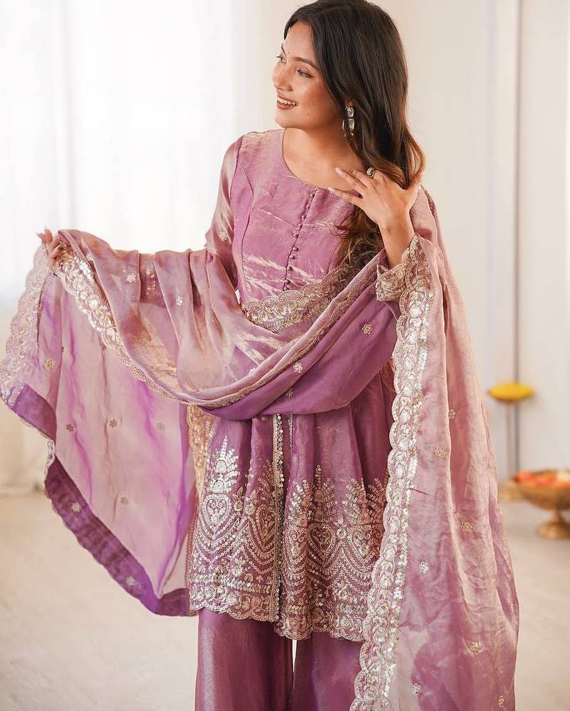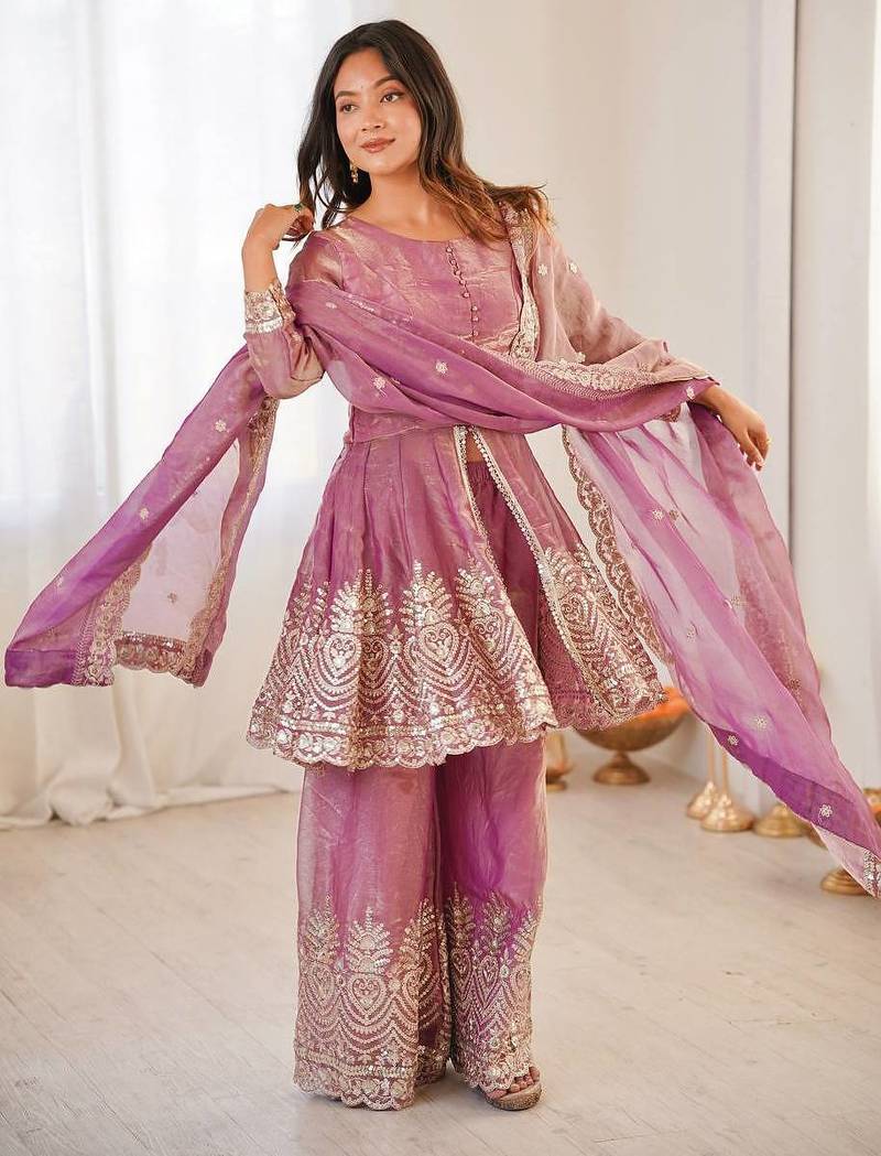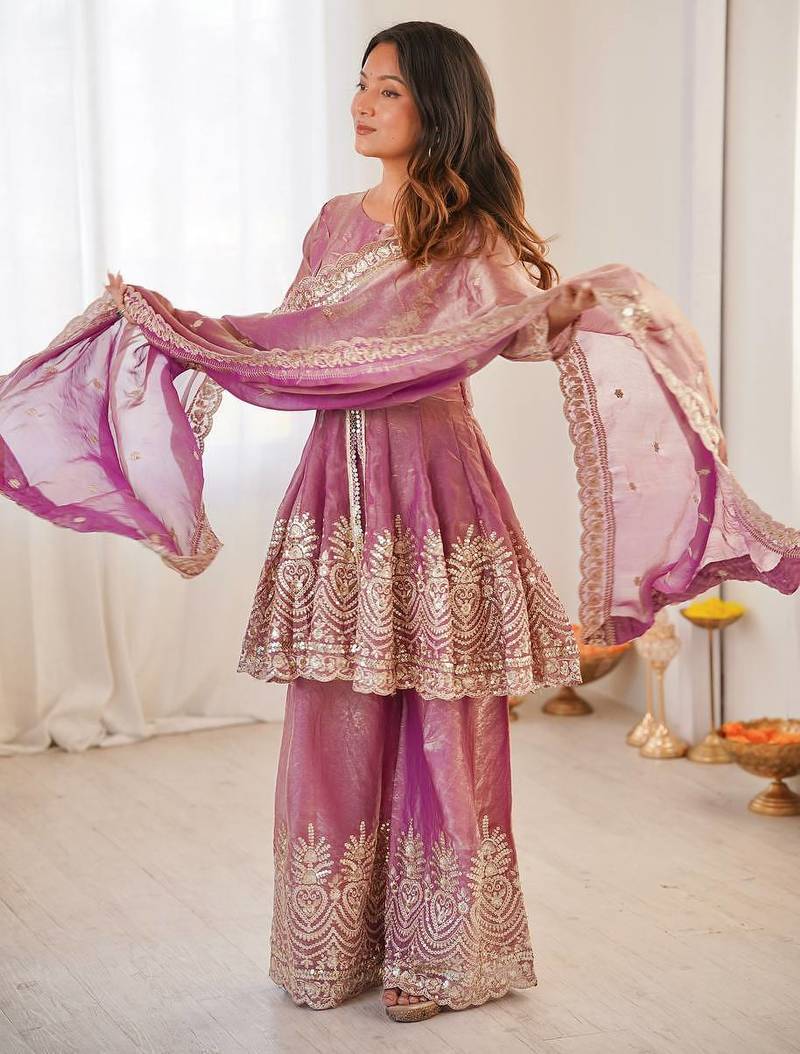 Pink two tone fandy silk heavy embroidery sequins & mirror work fully stitched kurti palazzo set