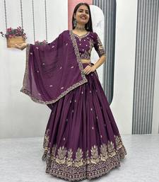 Plum purple chinon embroidered lehenga choli set with thread work, fully stitched outfit