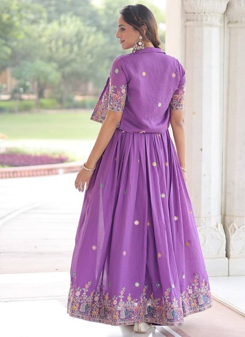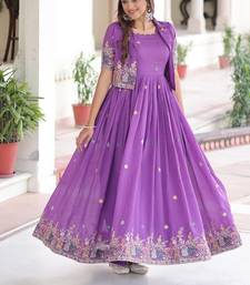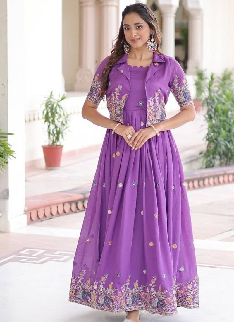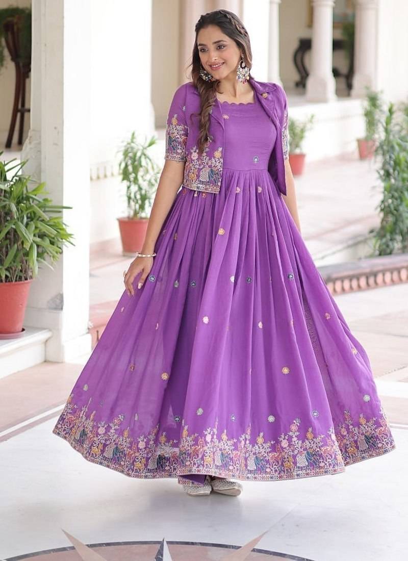 | Product Name | Purple Vichitra Silk Embroidered Gown With Sequins And Zari Work, Standard Stitched Koti Outfit | |