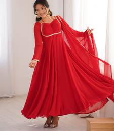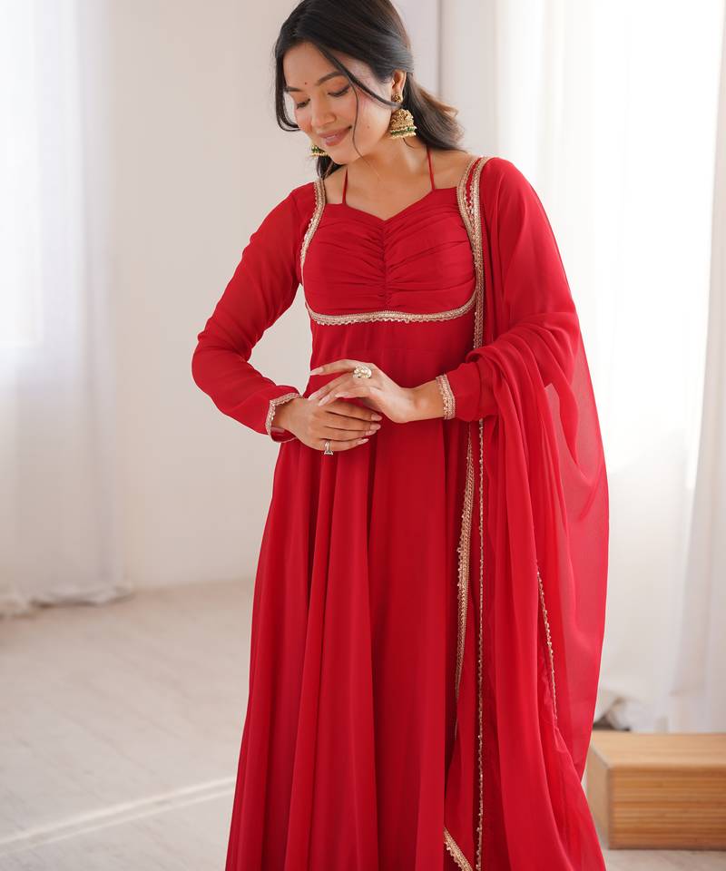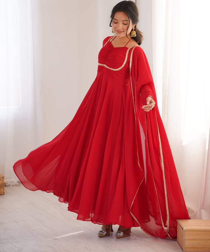| Product Name | Red Pure Fox Blooming Georgette Fully Stitched Flared Anarkali Gown With Designer Dori Neck | |
