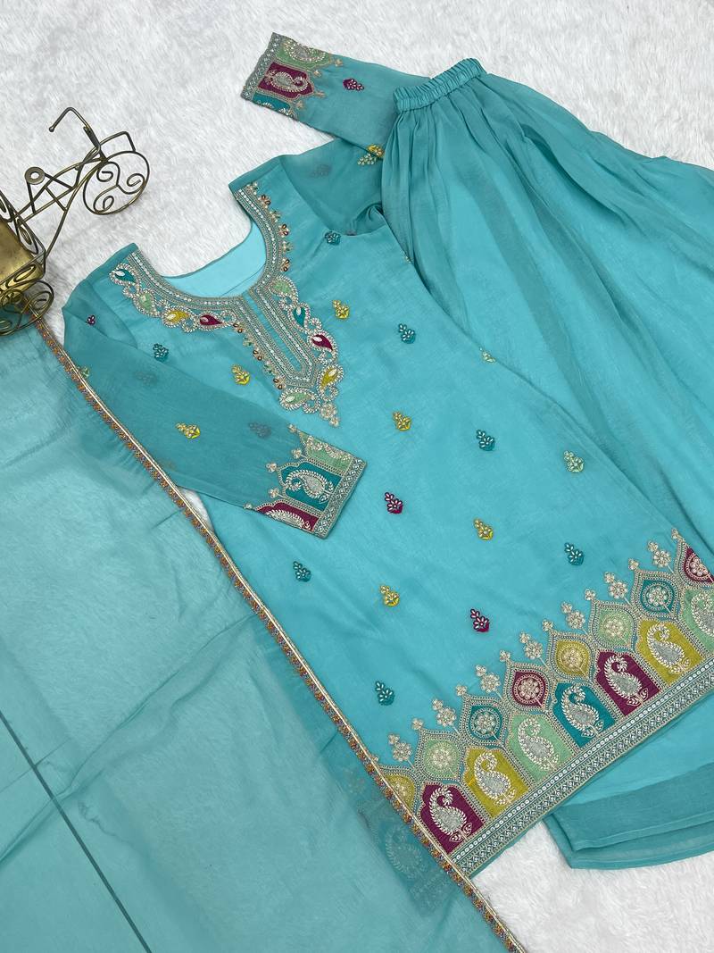 Sky blue embroidered thread work soft crunchy silk fully stitched kurta sharara set