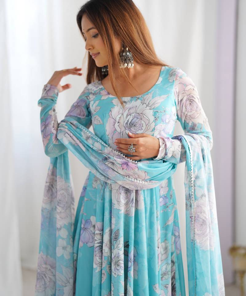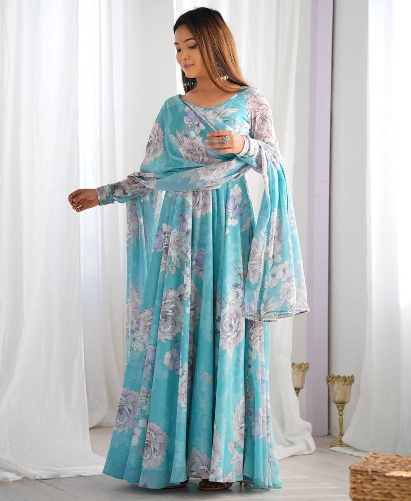 | Product Name | Sky Blue Floral Printed Pure Fox Georgette Fully Stitched Flared Anarkali Gown | |