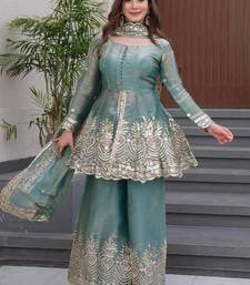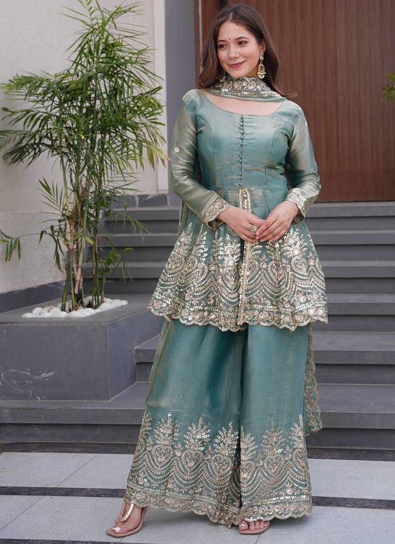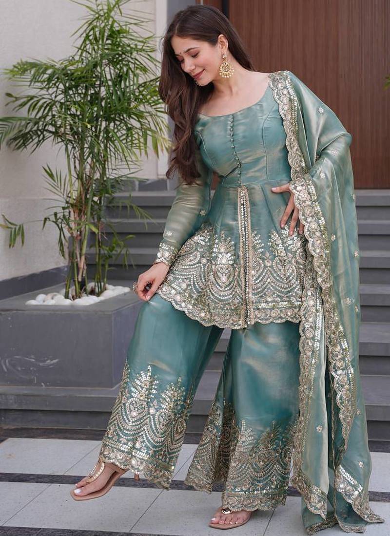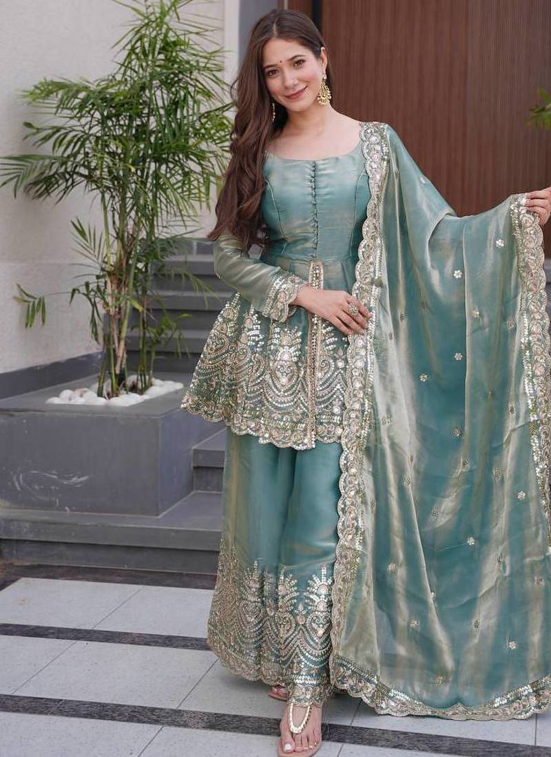 | Product Name | Sky Blue Two Tone Fandy Silk Heavy Embroidery Sequins & Mirror Work Fully Stitched Kurti Palazzo Set | |