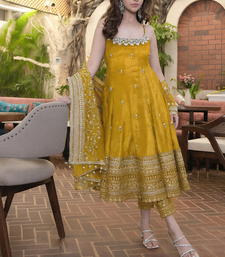 Yellow vichitra silk embroidered gown dupatta set stitched