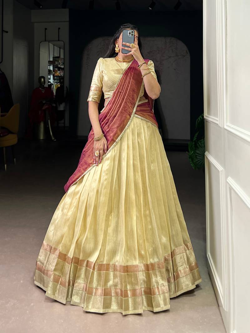 Yellow zari weaving dupion silk lehenga set,elegant traditional style with stitched blouse & dupatta