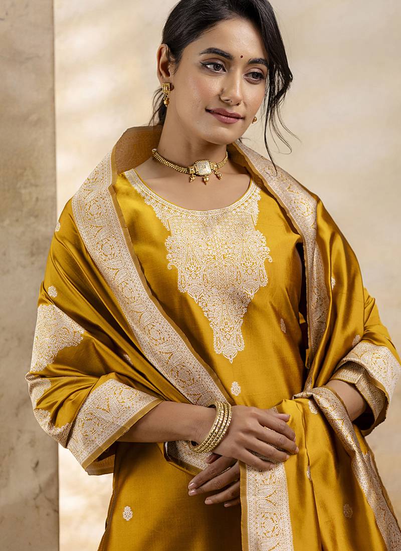 | Product Description | Bright Mustard Cotton Blend Suit With Weaving Design, Blending Comfort And Style For Festive Parties. |